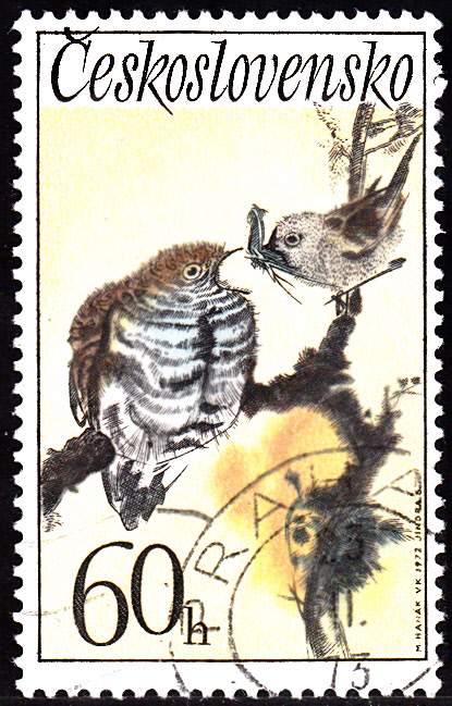 Auf dieser Marke aus der Tschechoslowakei (MiNr 2110) füttert eine Gartengrasmücke (Sylvia borin) einen Kuckuck (Cuculus canorus).