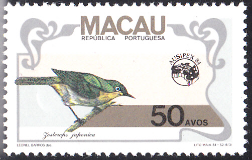 Auf dieser Marke aus Macau (MiNr 524) zu der Internationalen Briefmarkenausstellung AUSIPEX ’84 in Melbourne ist ein solcher Japanbrillenvogel zu sehen.