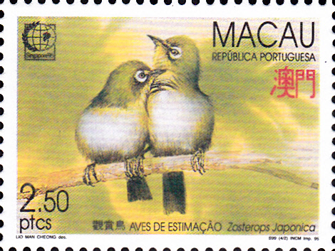 Auf einer weiteren Marke aus Macau (MiNr 815) sind zwei Japanbrillenvögel (Zosterops japonica) abgebildet.