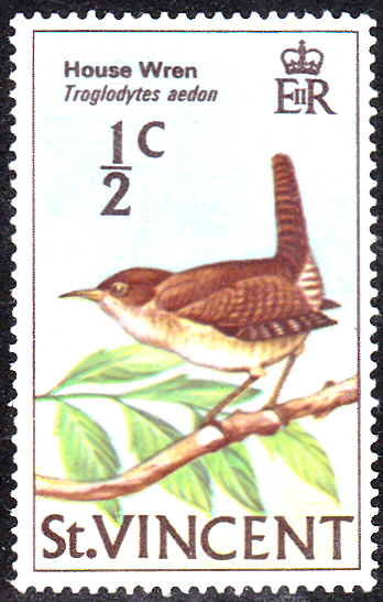 Auf dieser Marke aus einer Freimarkenserie "Einheimische Vögel" aus St. Vincent (MiNr 258) ist ein Hauszaunkönig (Troglodytes aedon) abgebildet.