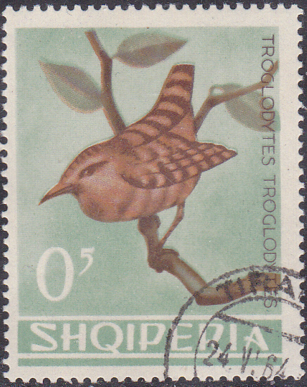 Auf dieser Marke aus einer albanischen Serie "Vögel" (MiNr 849) zeigt einen Zaunkönig (Troglodytes troglodytes).