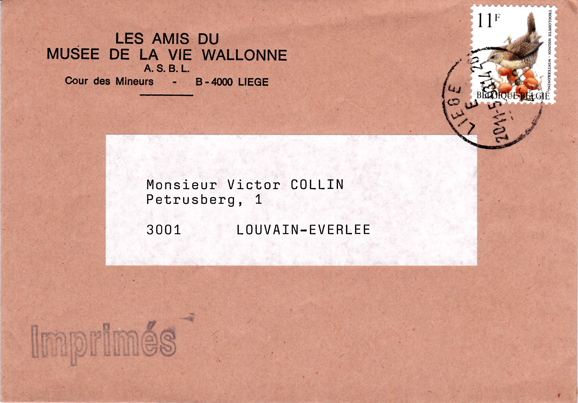 Die bereits gezeigte belgische Marke mit einem Zaunkönig (MiNr 2502) ist hier auf einer Drucksache als Porto verwendet worden.