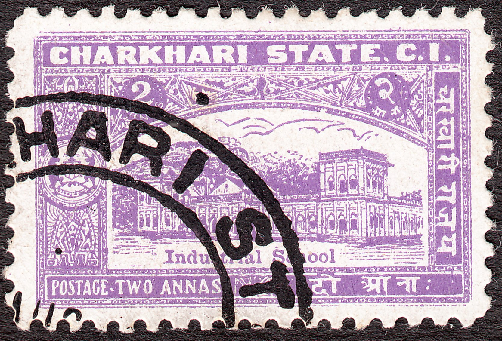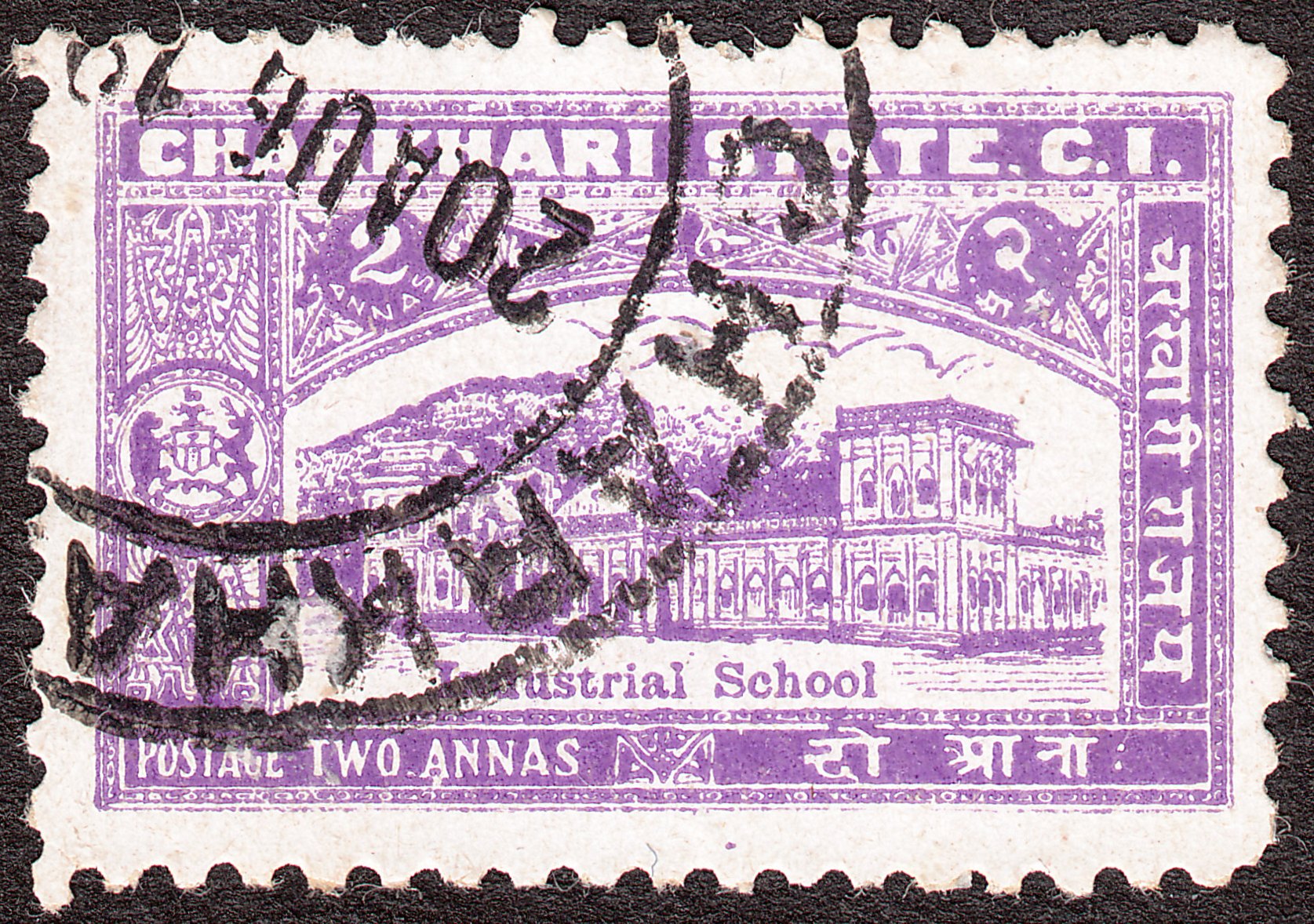 Am 23.06.1931 erschien innerhalb eines Satzes von 9 Werten diese Freimarke zu 2 Annas in Violett, die als Motiv "Industrial School" = Industrieschule zeigt: