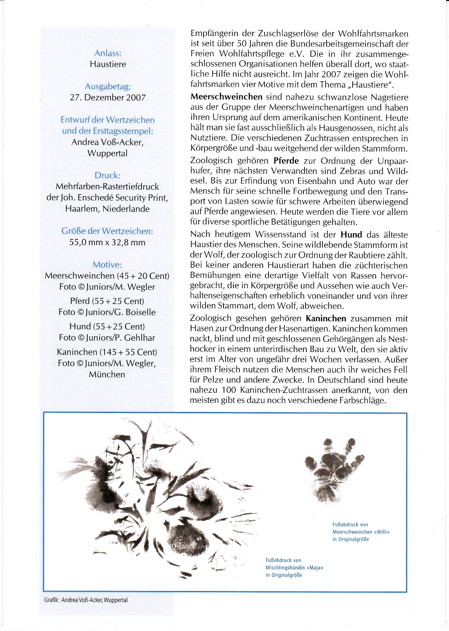 Auf dem Ersttagsblatt der Deutschen Post sind die vier Marken der Wohlfahrtsmarkenserie 2007 verklebt und mit dem Ersttagsonderstempel gestempelt. Auf der Rückseite findet man ein paar Infos zu den Marken und den Haustieren.