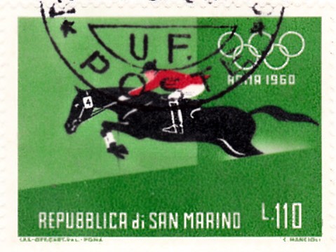 Auf einer Marke aus San Marino (MiNr 654) zu den Olympischen Sommerspielen 1960 wird ein Springreiter gezeigt.