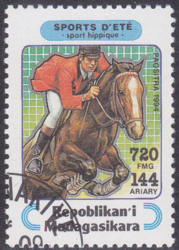 Diese Marke aus Madagaskar (MiNr 1714) bildet eine Springreiter beim Überqueren eines Hindernisses ab.