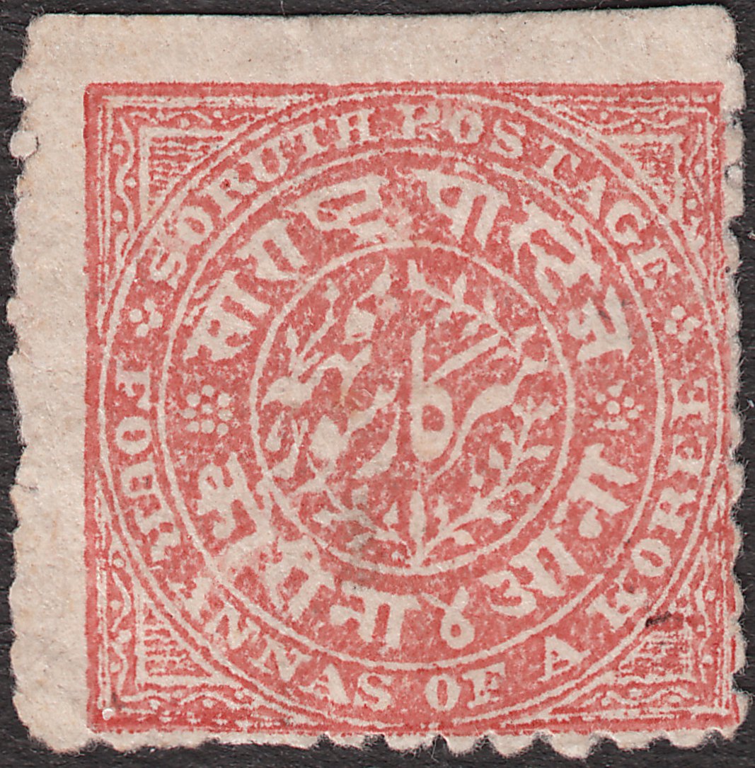Diese als Soruth MiNr. 9 katalogisierte Freimarke zu 4 Annas gezähnt in rot erschien 1886: