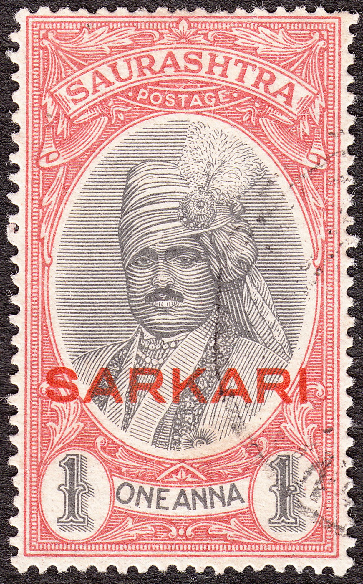 Die Freimarke Soruth MiNr. 20 wurde mit einem Aufdruck "SARKARI" versehen als Dienstmarke ausgegeben: