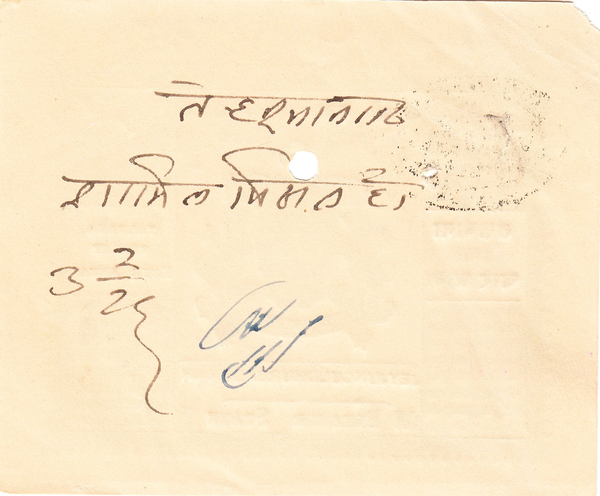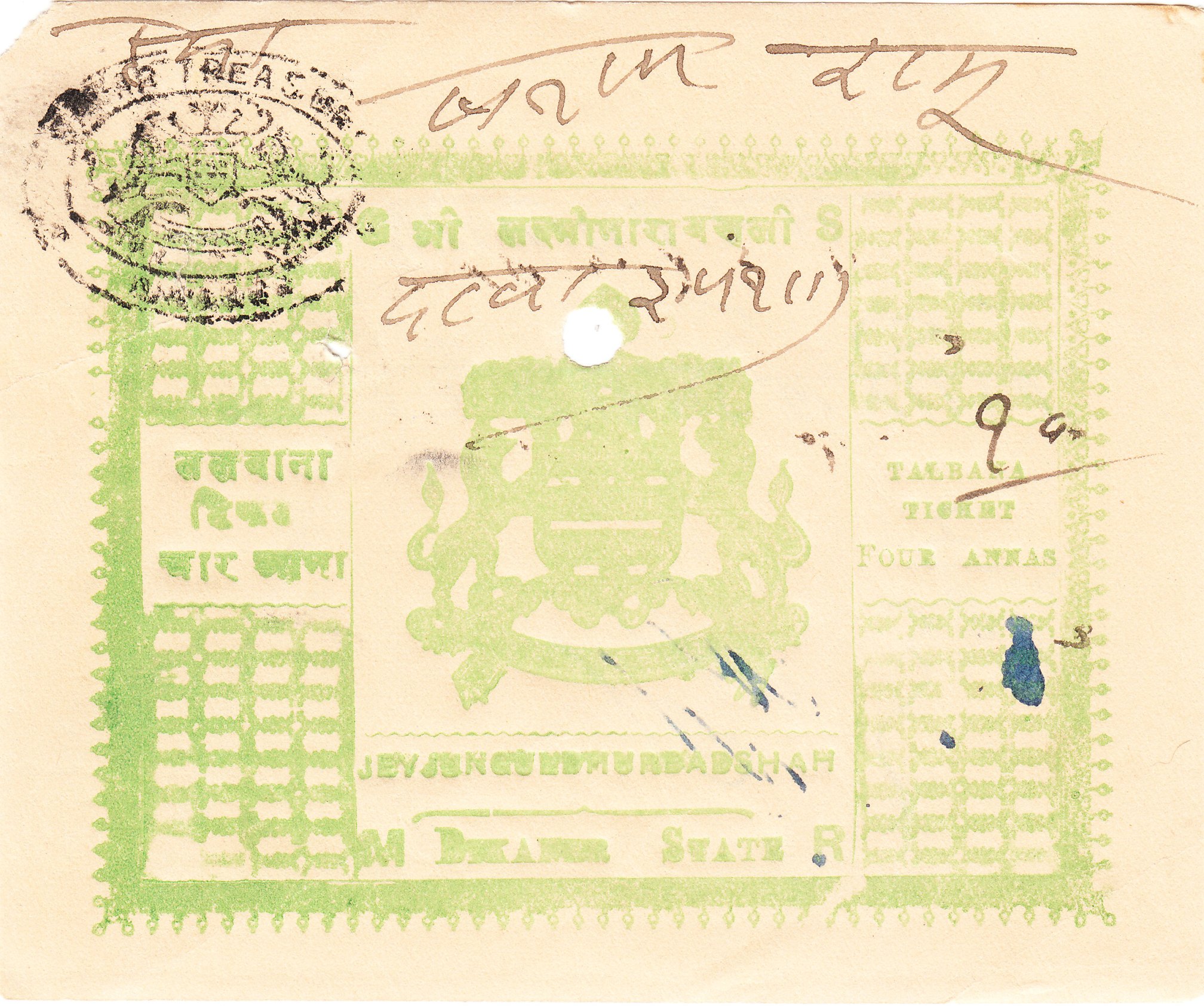 Hier ein "TALBANA TICKET" = eine Prozeßkostenquittung zu 4 Annas in gelbgrün: