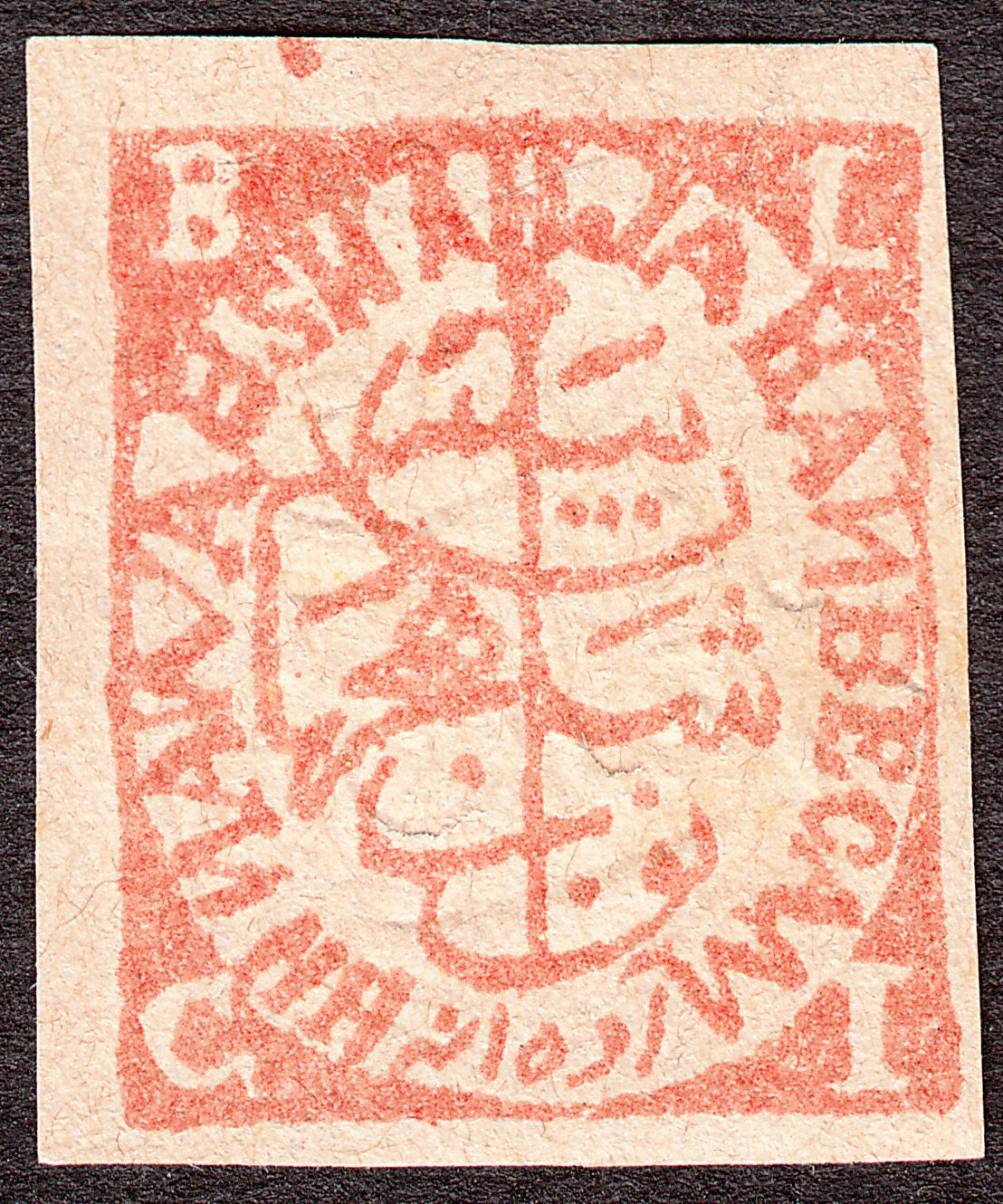 Bei diesem ungezähnten Exemplar lautet die Inschrift "NAWAR", es handelt sich somit um eine MiNr. 14 I B.