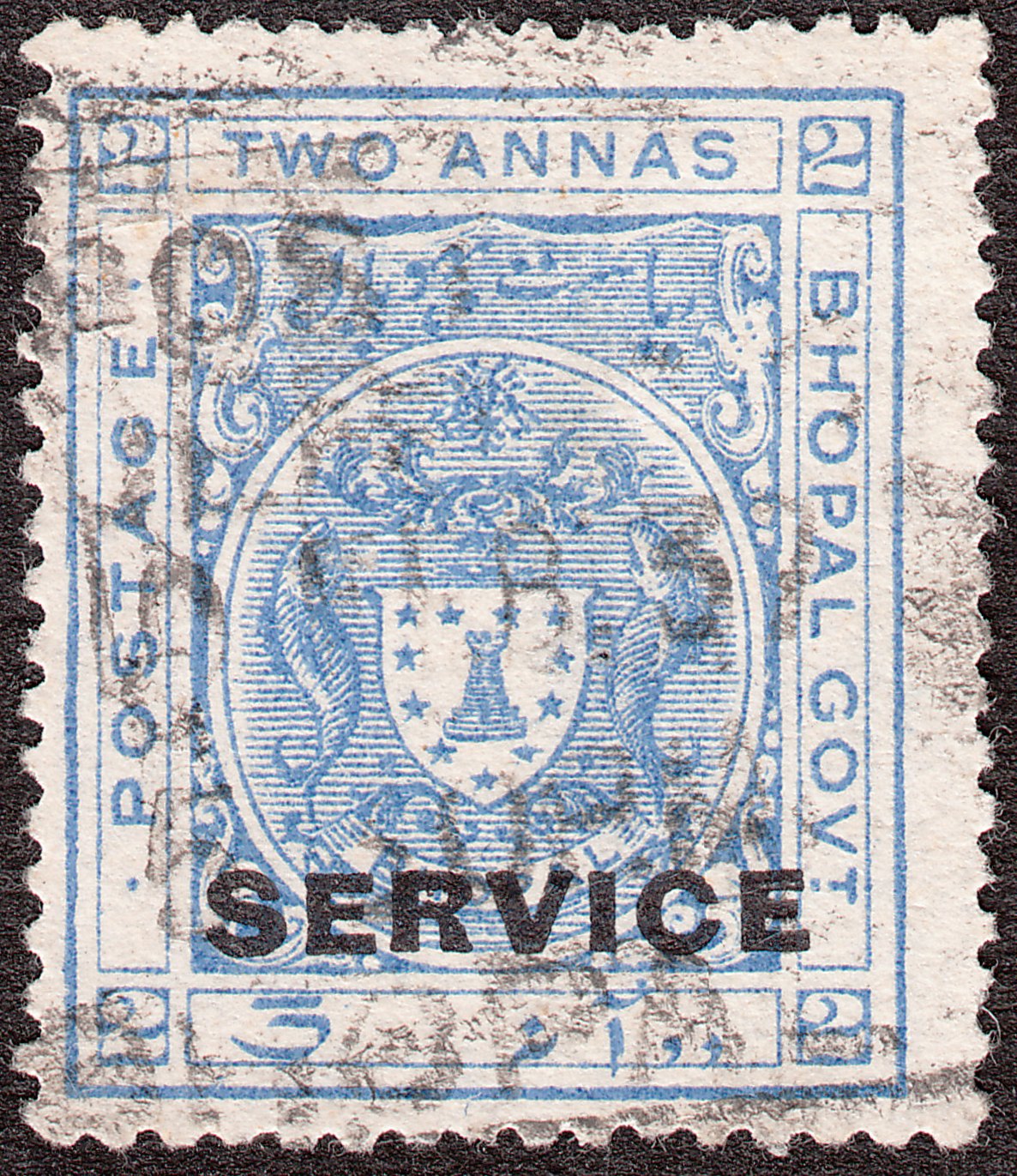 Diese Marke zu 2 Annas in blau erschien mit Inschrift links "POSTAGE" sowie rechts "BHOPAL GOVT" = Government und ist katalogisiert als Bhopal MiNr. D 12: