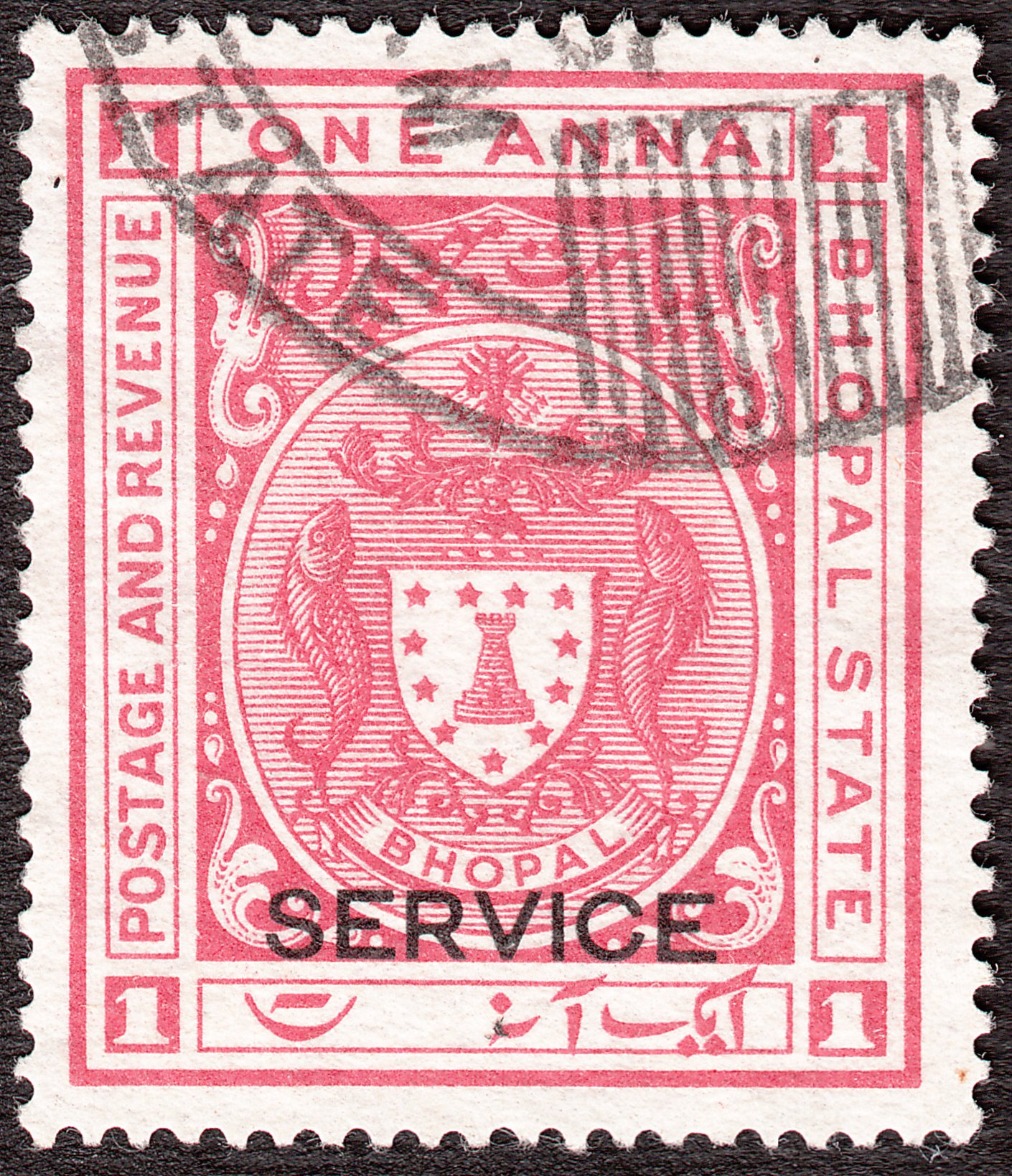 Diese Dienstmarke zu 1 Anna in karmin mit Aufdruck "SERVICE" in Zeichnung der Freimarke Bhopal MiNr. 28 in grösserem Format, Bildgröße 25 : 30 mm, wurde katalogisiert als Bhopal MiNr. D 6: