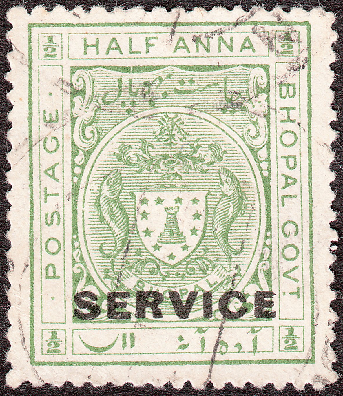 Von 1908 bis 1949 erschienen in Bhopal insgesamt 49 verschiedene Dienstmarken.