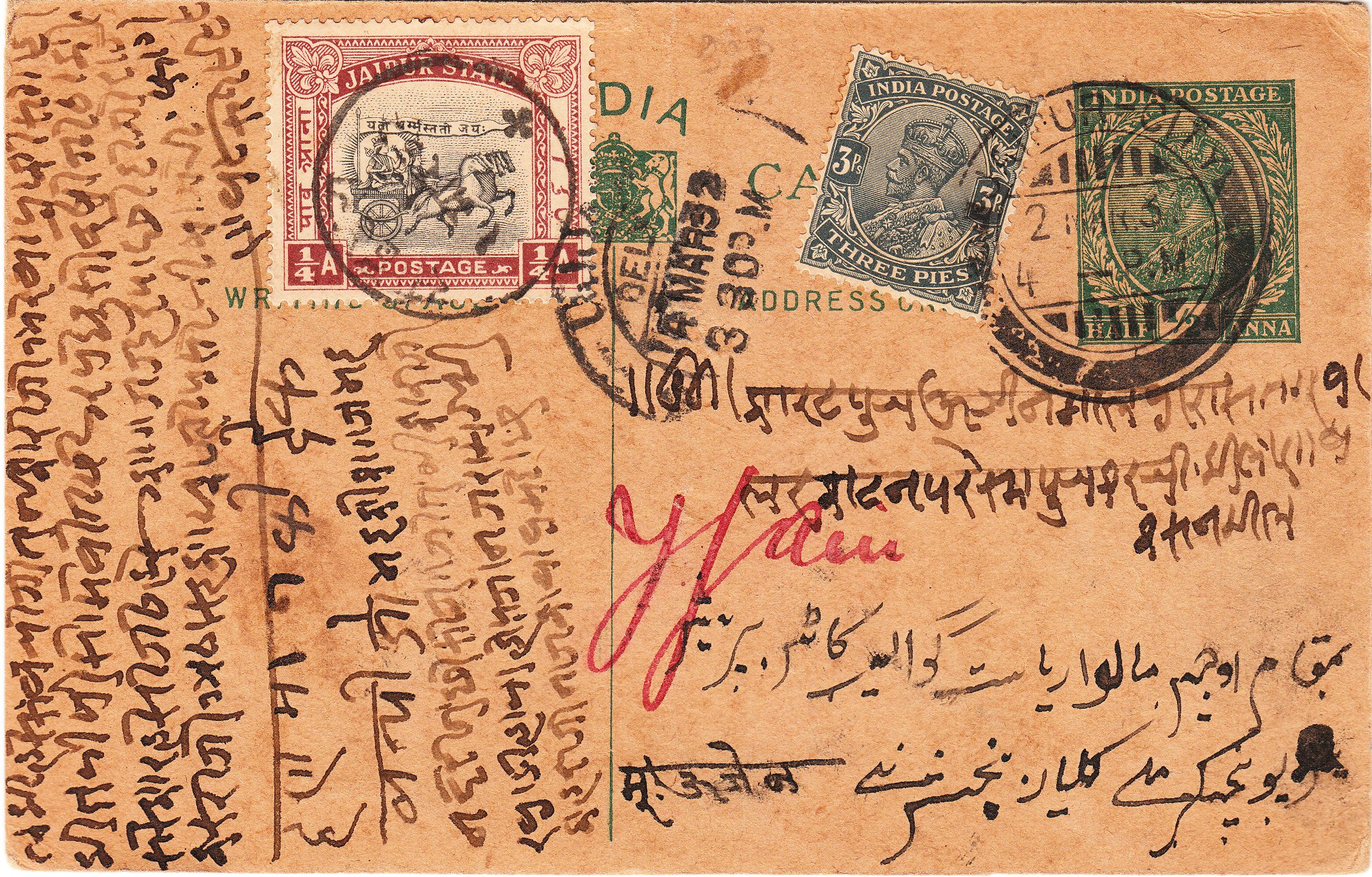 Hier dient sie als Zusatzfrankatur auf einer indischen Ganzsache mit Werteindruck 1/2 Anna, die als weitere Zusatzfrankatur eine indische Freimarke zu 3 Pies trägt: