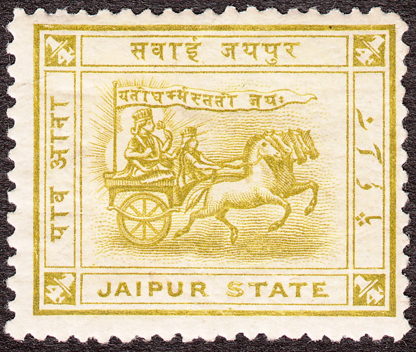 Diese Freimarke zu 1/4 Anna in olivgelb zeigt einen Sonnenwagen, gezogen von der siebenköpfigen Stute "Utschislas", obere Inschrift in Hindi "Sawai Jaipur", links und rechts Wertangabe in Hindi und Urdu: