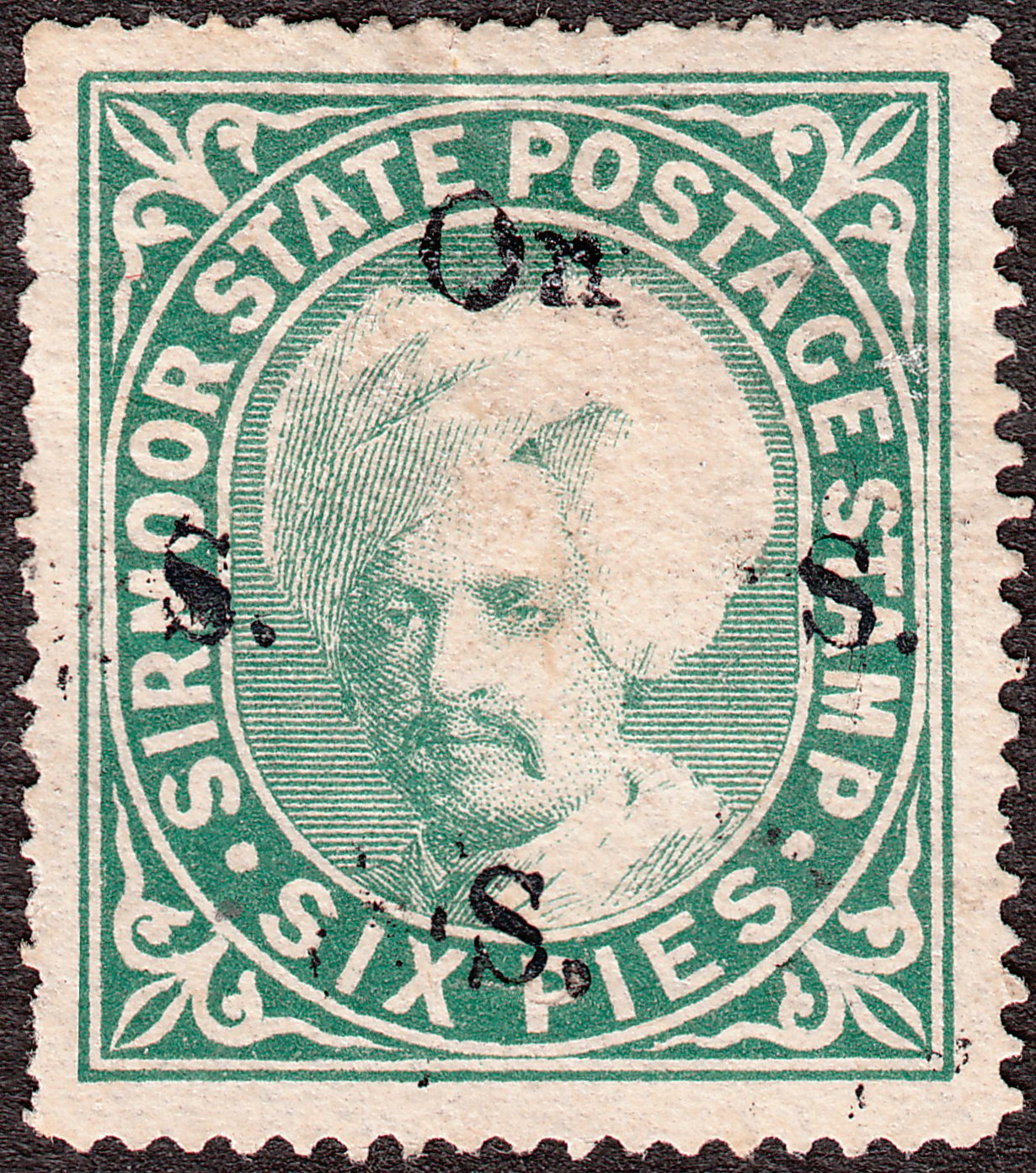 Die Freimarke Sirmur MiNr. 4 zu 6 Pies in grün wurde mit schwarzem Aufdruck "On S. S. S." versehen als Dienstmarke ausgegeben: