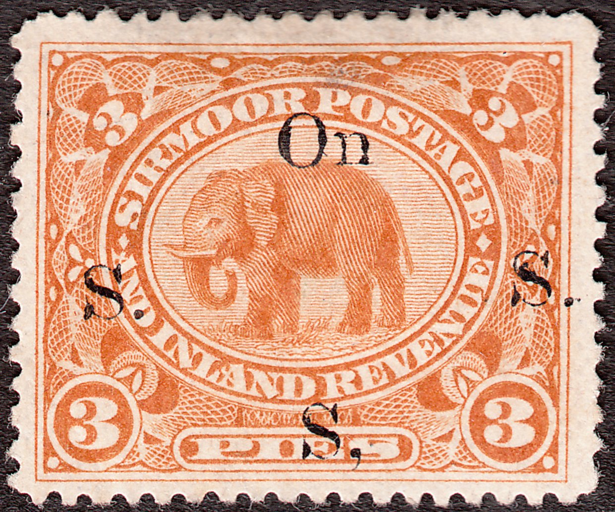Diese Freimarke Sirmur MiNr. 8 zu 3 Pies in braunorange erhielt 1896 einen schwarzen Aufdruck "On S. S. S.":