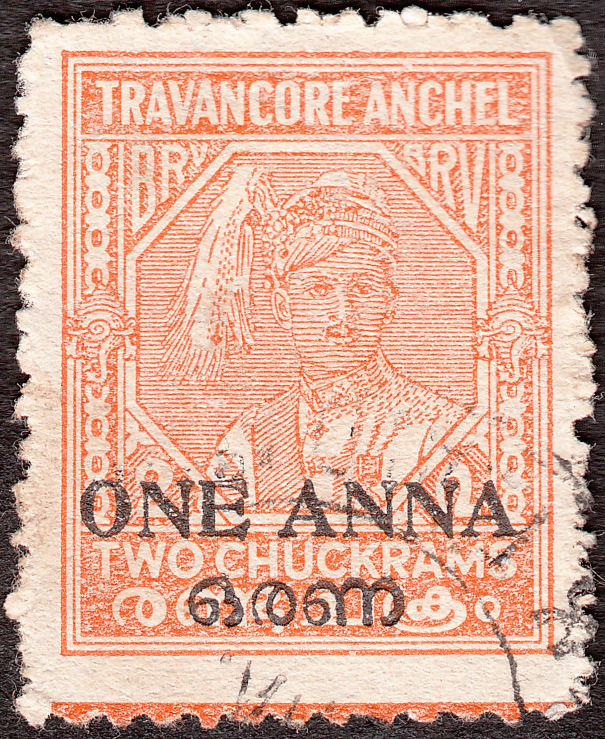 Die Freimarke Travancore MiNr. 39 wurde am 01.07.1949 mit Aufdruck des neuen Wertes in schwarz ausgegeben und als Travancore-Cochin MiNr. 4 katalogisiert: