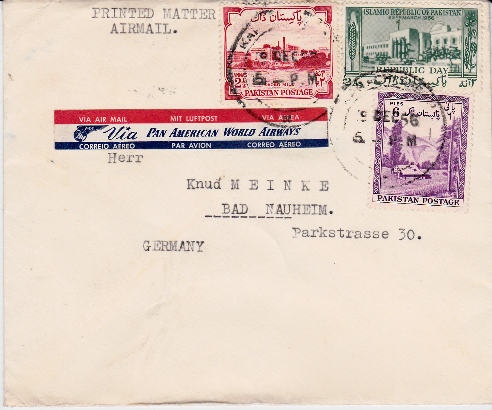 Drucksache per Luftpost nach Bad Nauheim vom 9. Dez. 1956. Zur Frankatur wurden folgende Marken benutzt: Marke zu 6 Pies (MiNr 65) aus der Freimarkenausgabe "7 Jahre Unabhängigkeit", Marke zu 2 1/2 Annas (MiNr 73) aus der Freimarkenserie "8 Jahre Unabhängigkeit" und die Sondermarke zu 2 Annas (MiNr 82) "Proklamation der Republik".