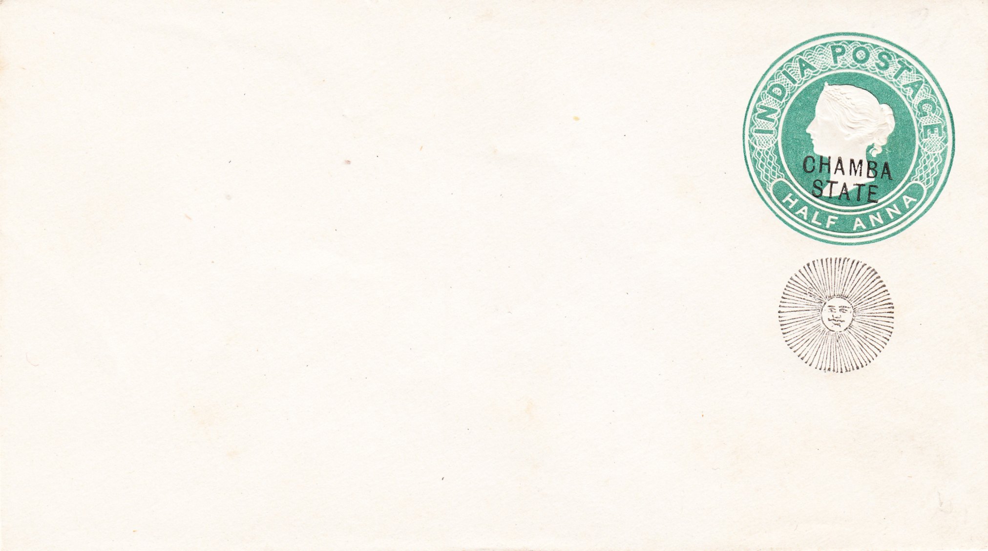 Hier eine Ganzsache mit Wertzeicheneindruck "INDIA POSTAGE HALF ANNA" in grün mit zweizeiligem schwarzem Aufdruck "CHAMBA STATE":