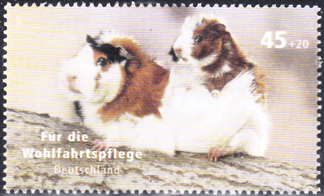 Auf der 45-Cent- Zuschlagsmarke "Für die Wohlfahrtspflege" aus dem Jahr 2007 sieht man zwei entzückende Exemplare der Gattung Meerschweinchen. Beim Stempel handelt es sich um den Ersttagsstempel aus Bonn vom 27.12.2007 mit einem Abdruck einer Hundepfote. Leider wurde für die Meerschweinchen kein gesonderter "Fußabdruck" heraus gebracht.