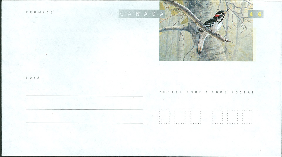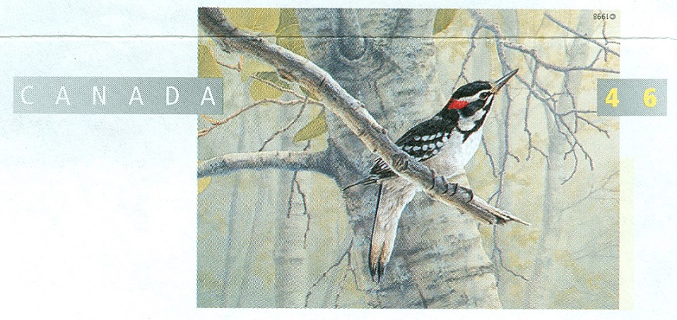 Für diese canadische Ganzsache des Jahres 1998 entschied man sich für das Motiv "Haarspecht". Ob das Motiv graphisch gut umgestzt wurde kann jeder für sich entscheiden, denn ein paar Wikipedia-Commons-Fotos sind zum direkten Vergleich angefügt.