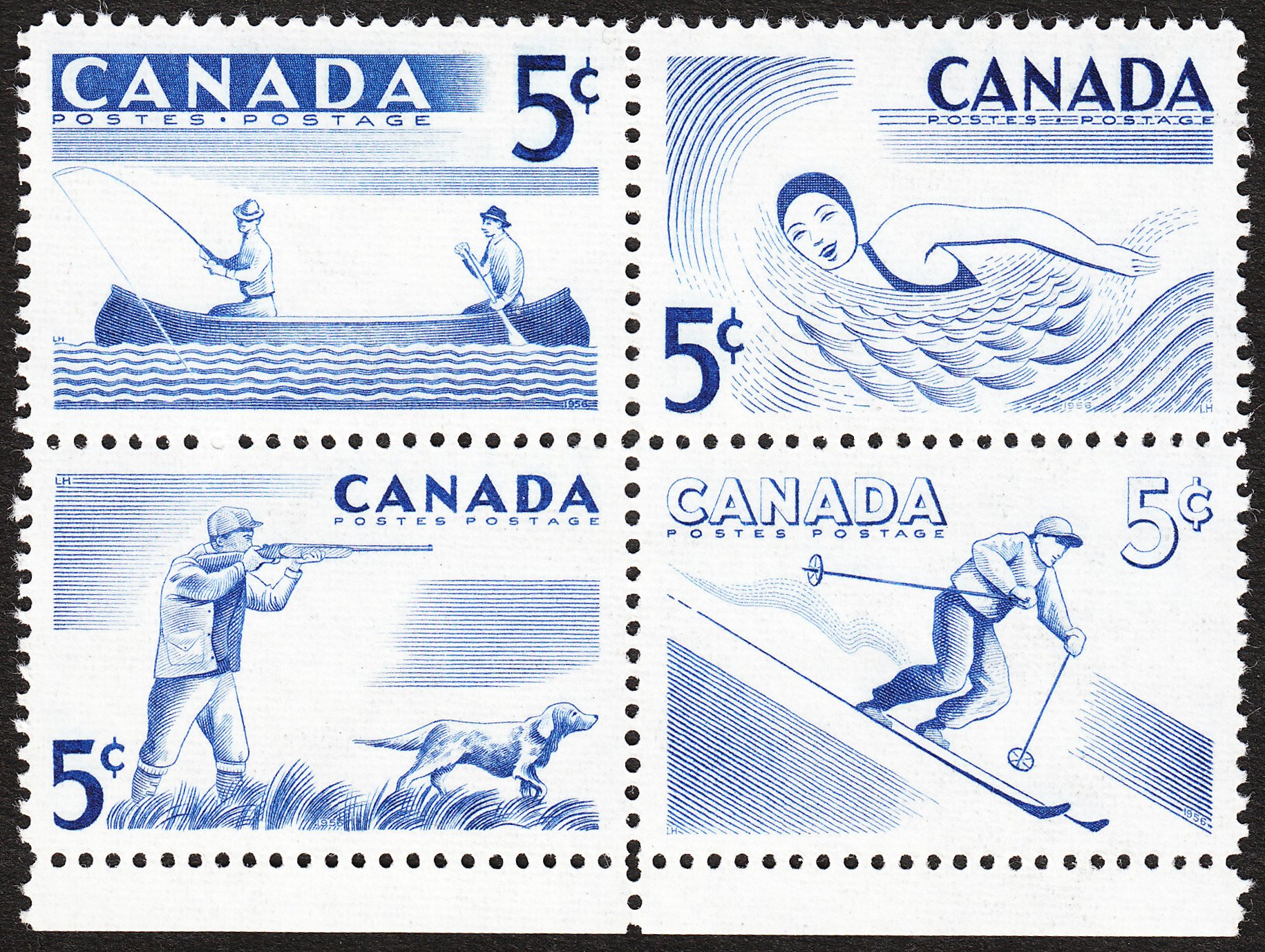 Dieser am 07.03.1957 erschienene Zusammendruck von vier Marken stellt einen Angler im Boot, eine Schwimmerin, einen Jäger mit Hund sowie einen Skiläufer dar und enthält auf jeder Marke die Information "LH", wohl als Stecherzeichen für den Stecher dieser im Stichtiefdruck hergestellten Postwertzeichen sowie als Jahrgang "1956":