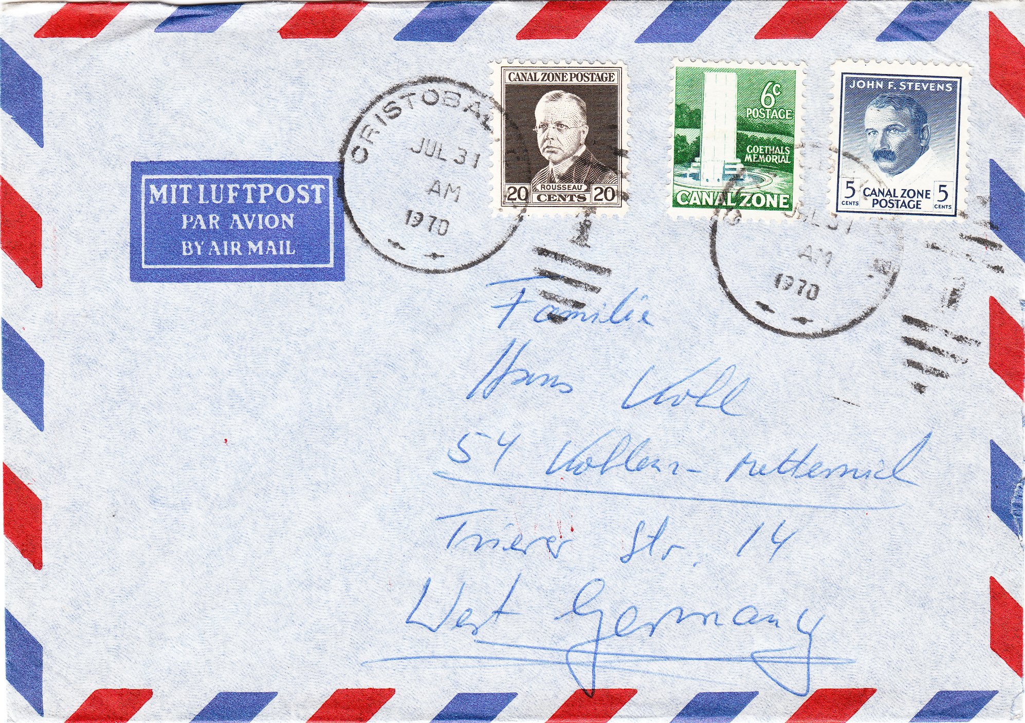 Dieser nach Deutschland adressierte Brief wurde am 31.07.1970 mit den MiNrn. 77, 122 und 167 frankiert: