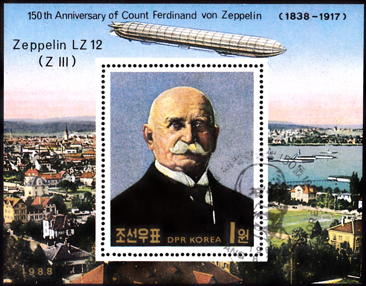 Zum 150. Geburtstag von Ferdinand Graf von Zeppelin ist in Nord-Korea ein Block (MiNr Block 237 mit Marke 2952) erschienen. Die Marke zeigt ein Porträt von Ferdinand Graf von Zeppelin und auf dem Blockrand über der Marke das Luftschiff LZ 12 (Z III).