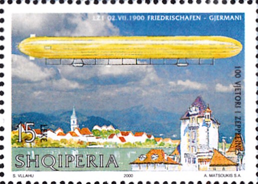 Aus Albanien kommt diese Marke (MiNr2771) mit LZ-1 über Friedrichshafen bei der Jungfernfahrt am 2.7.1900.