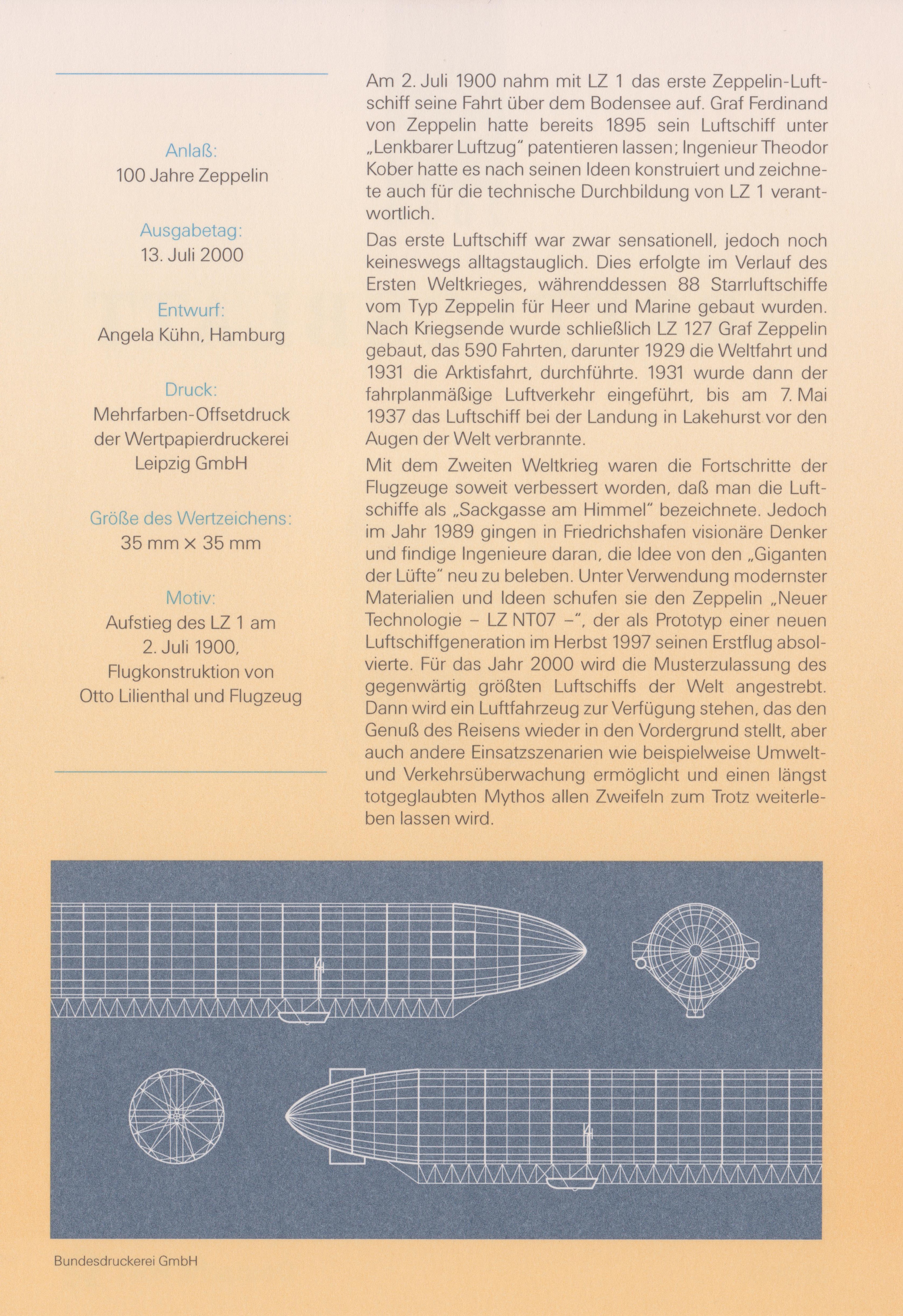 Zum Jubiläum "100 Jahre Zeppelin-Luftschiffe" erschien bei der Deutschen Post eine Marke mit der Abbildung des Luftschiffes LZ 1 aus dem Jahre 1900 von Ferdinand Graf von Zeppelin (1838-1917) und Konstruktionszeichnungen.