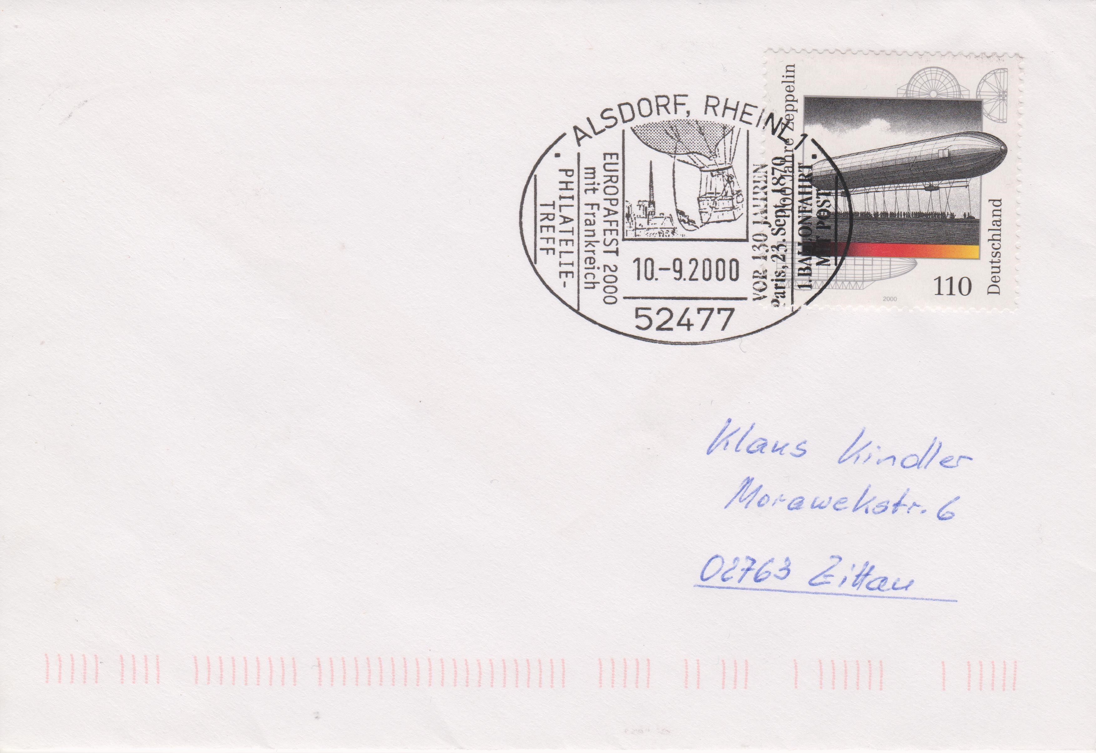 Bund MiNr. 2128 am 10.09.2000 als Einzelfrankatur auf einem Brief nach 02763 Zittau, aufgegeben in 52477 ALSDORF: