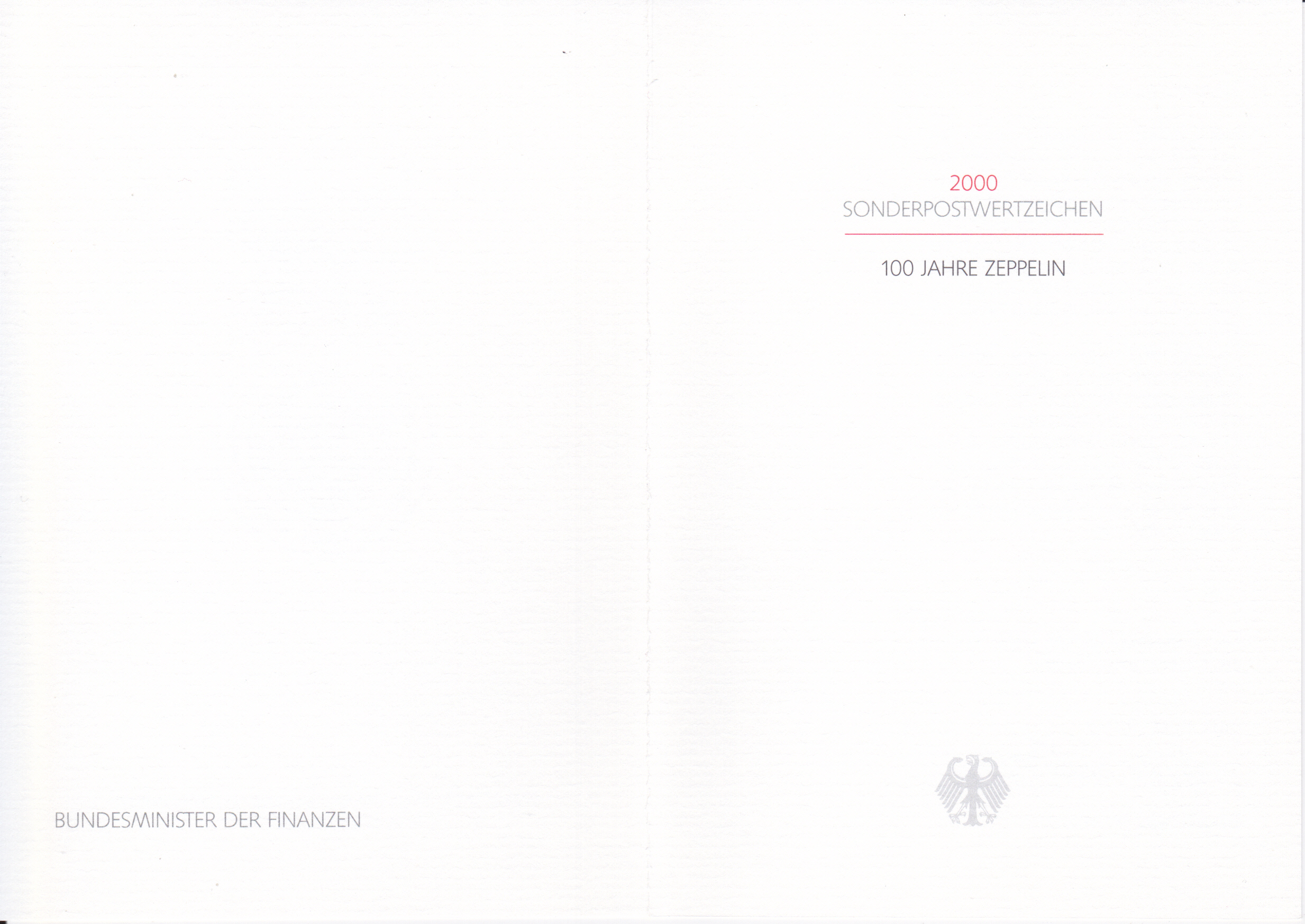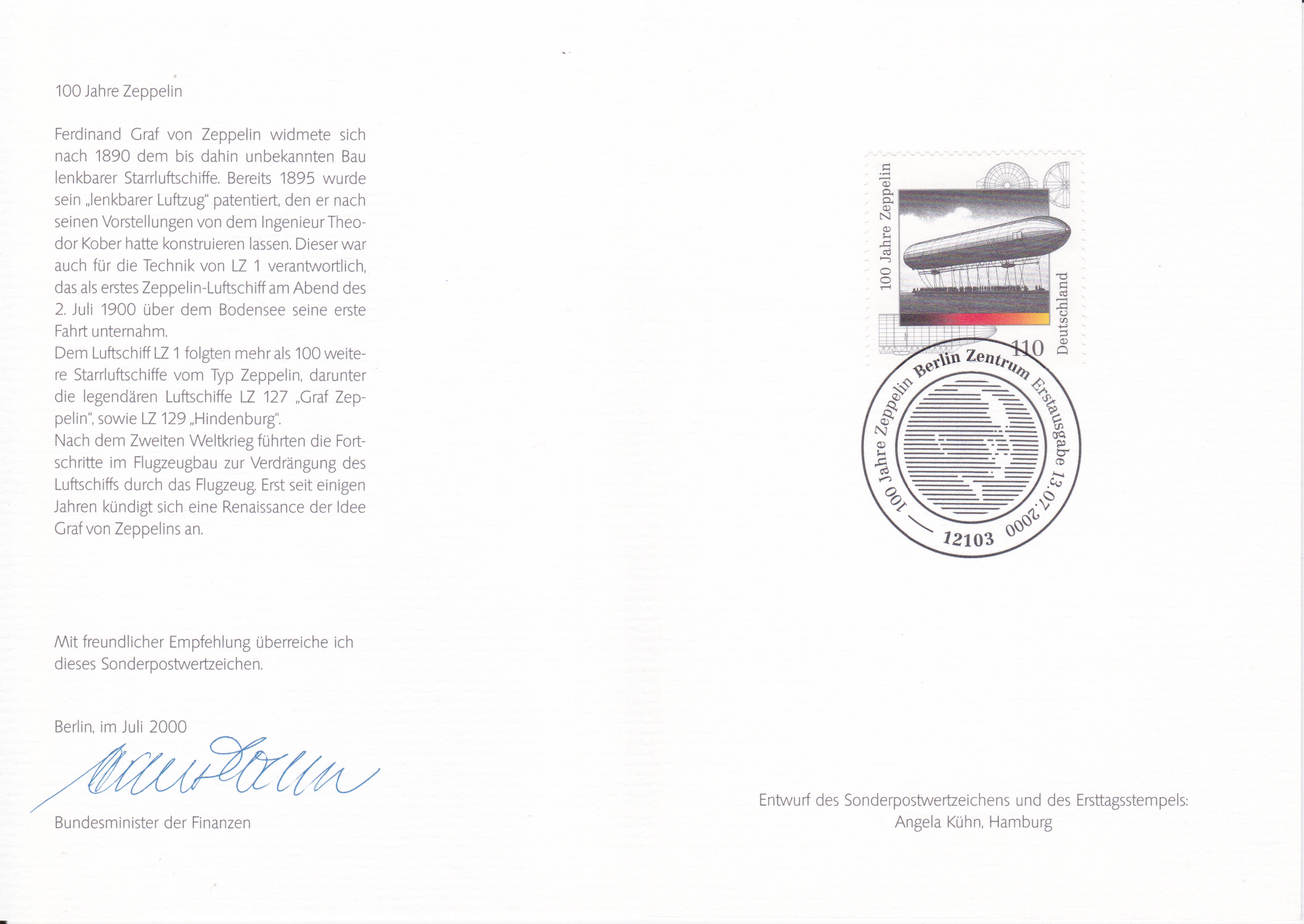 Ministerkarte des Finanzministers mit der Marke "100 Jahre Zeppelin-Luftschiffe" (MiNr 2128) und dem Ersttagsonderstempel Berlin.