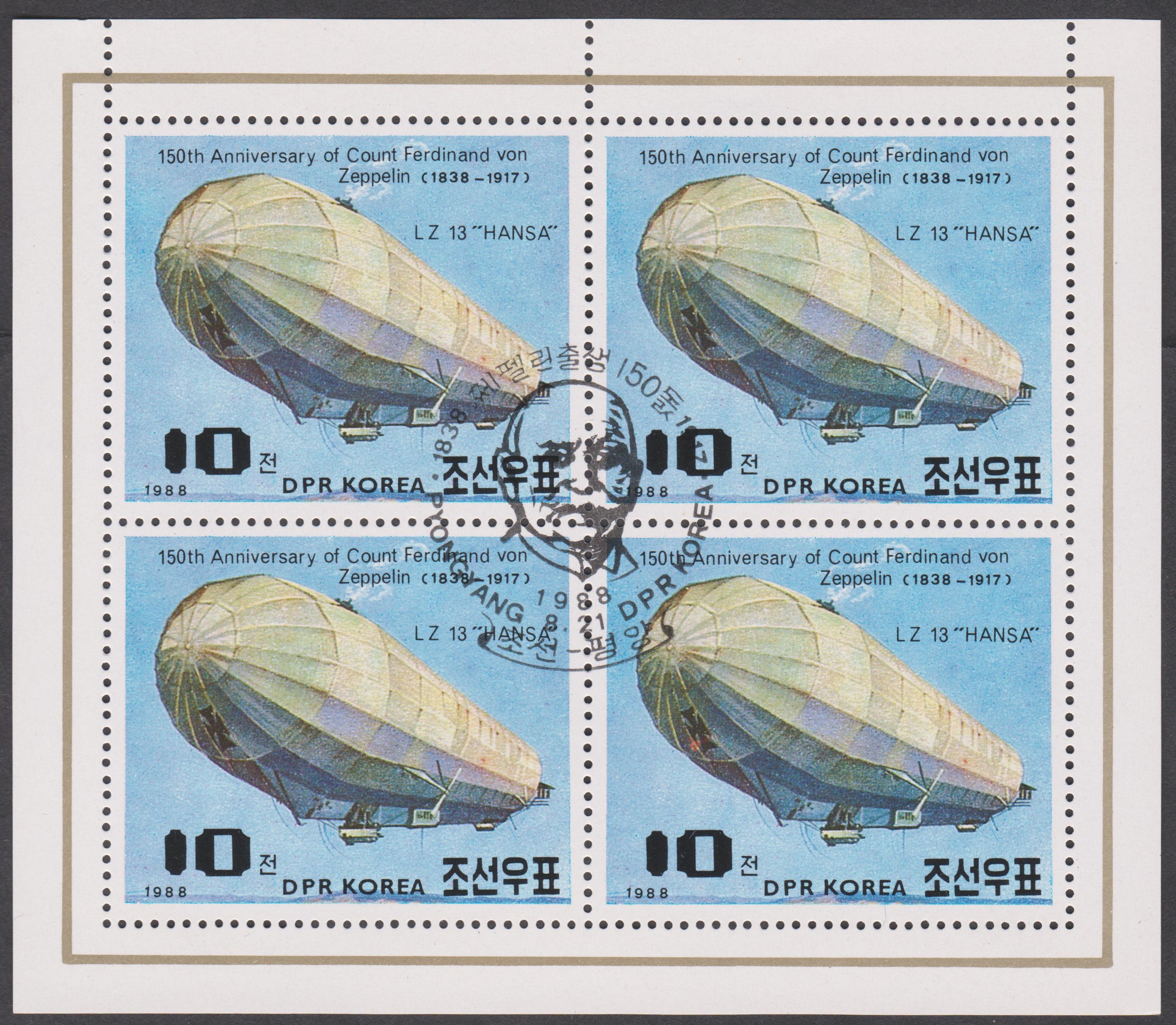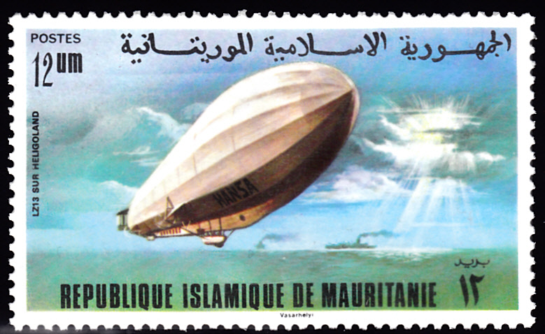 Eine Marke aus Mauretanien (MiNr 541) zeigt LZ 13 über der Nordsee bei Helgoland.