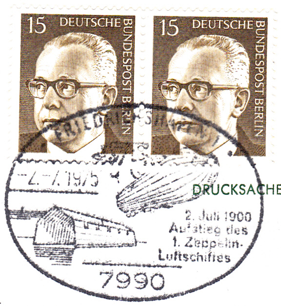 Zur Erinnerung an die erste Fahrt von LZ 1 wurde an 2.7.1975 in Friedrichshafen ein Sonderstempel eingesetzt, der LZ 1 im Stempelbild zeigt.