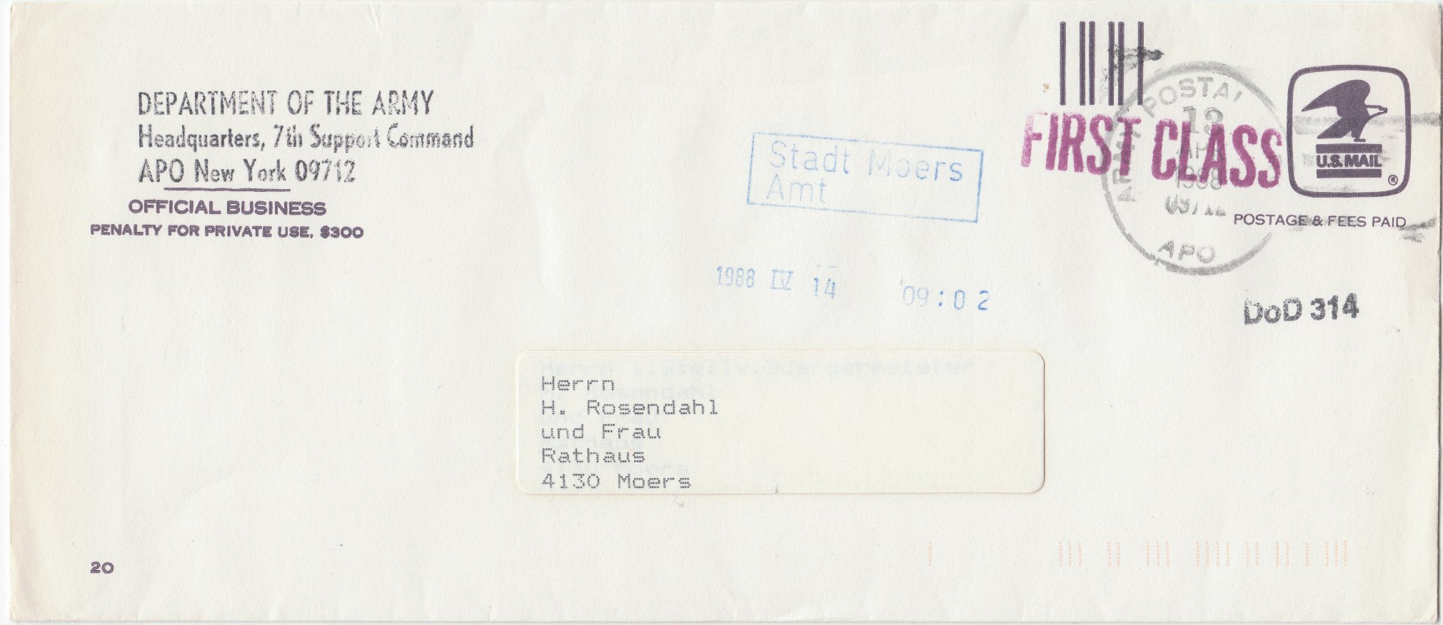 Dieser am 13.04.1988 aufgegebene Brief trägt als Absenderstempel DEPARTMENT OF THE ARMY, Headquarters, 7th Support Command, APO New York 09712. Die APO 09712-0005 DODDS, RHEINBERG (MOERS) ES war der Einheit der US Army in Rheinberg bei Moers zugeordnet, was auch exakt zum Empfänger paßt, der bei der Stadt Moers arbeitete, was ein Eingangsstempel vom 14.04.1988 dokumentiert: