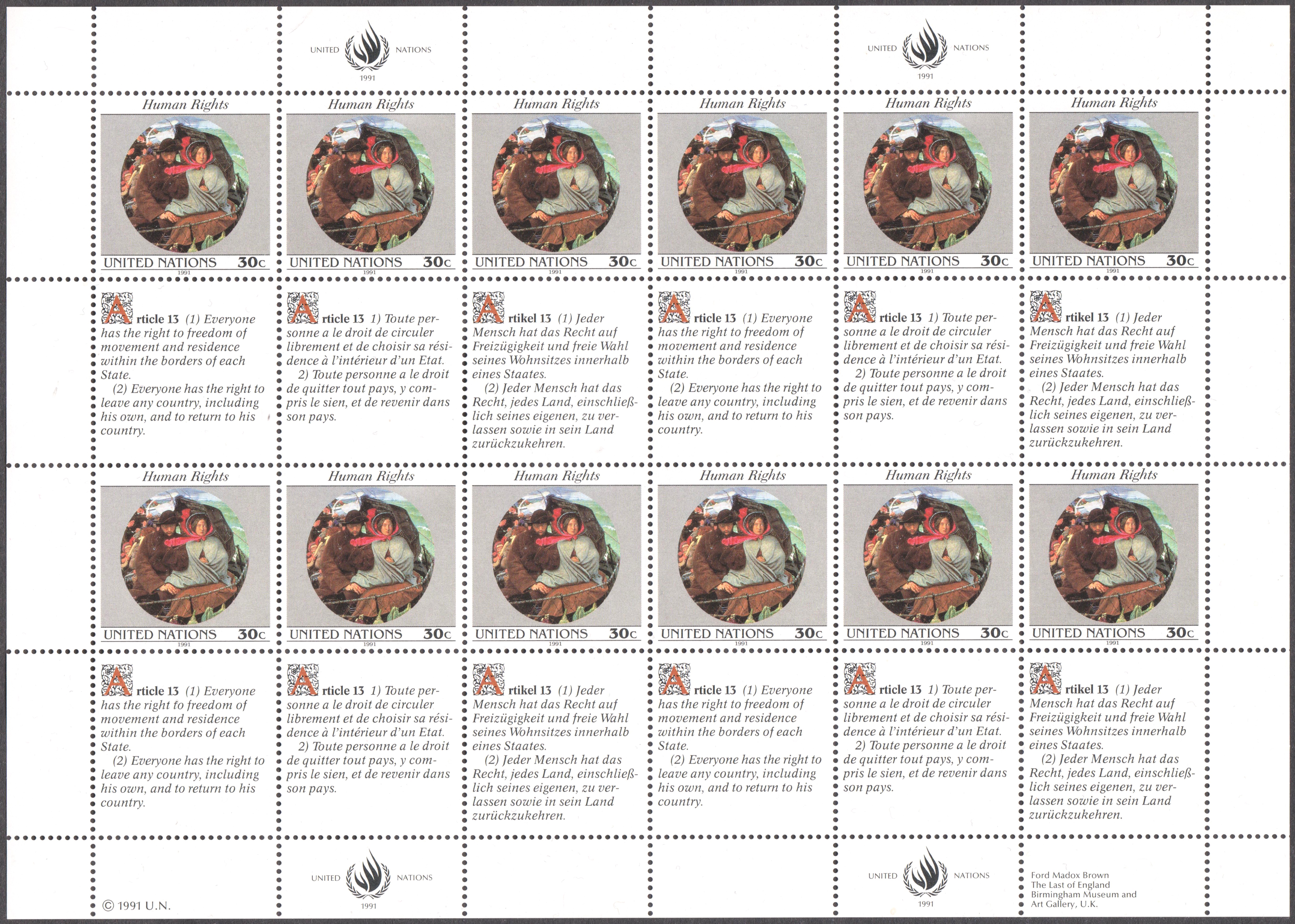 Die Zierfelder zu Vereinte Nationen - New York, MiNr. 623, zeigen Artikel 13 abwechselnd in englischer, französischer sowie deutscher Sprache: