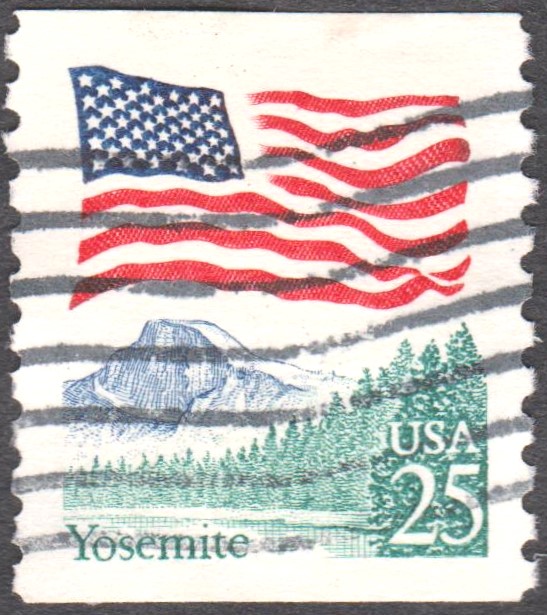 Auf dieser Freimarke, USA MiNr. 1978, flattert die Nationalflagge über dem Yosemite-Nationalpark im Wind: