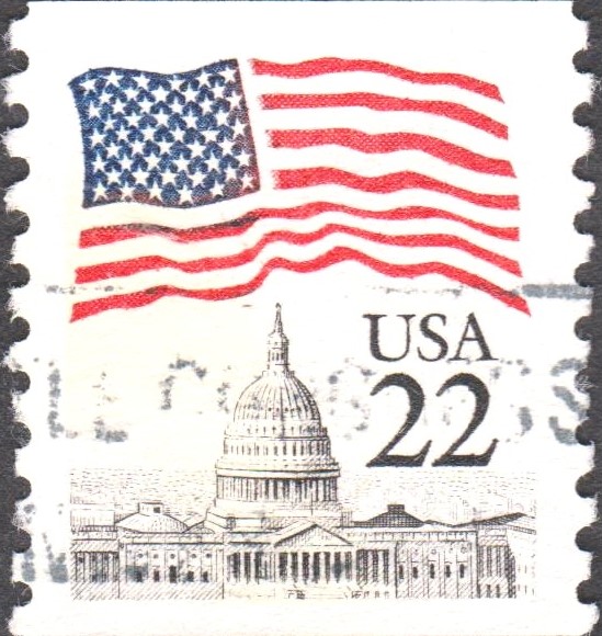 Auf dieser Freimarke, USA MiNr. 1738, flattert die Nationalflagge über dem Kapitol in Washington im Wind:
