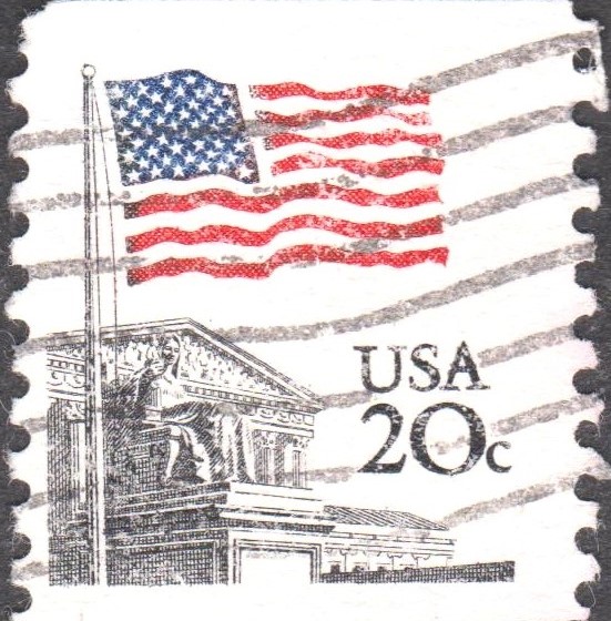Auf dieser Freimarke, USA MiNr. 1522 C, flattert die Nationalflagge vor dem Supreme Court Building, dem Gebäude des obersten Bundesgerichts in Washington im Wind: