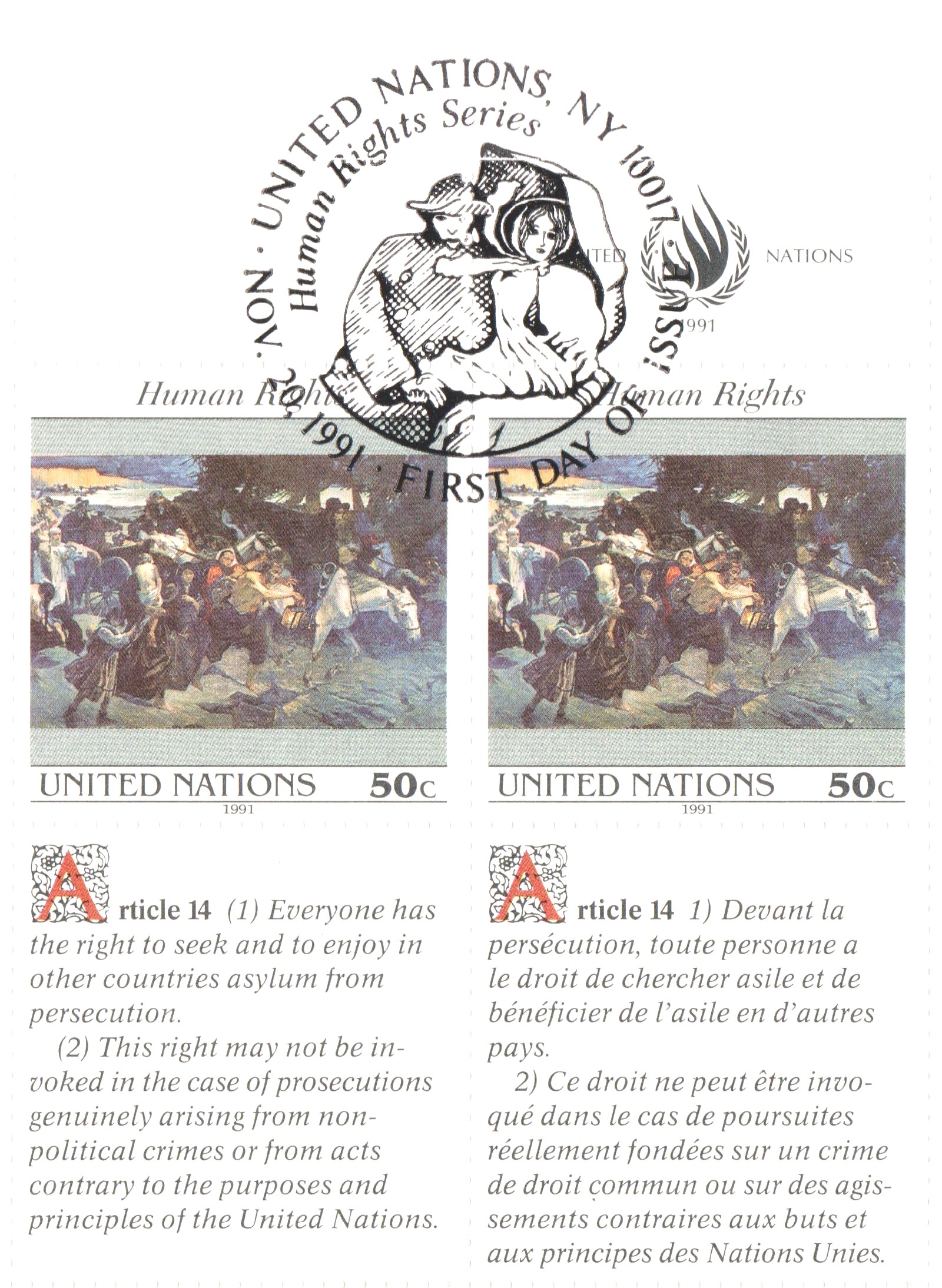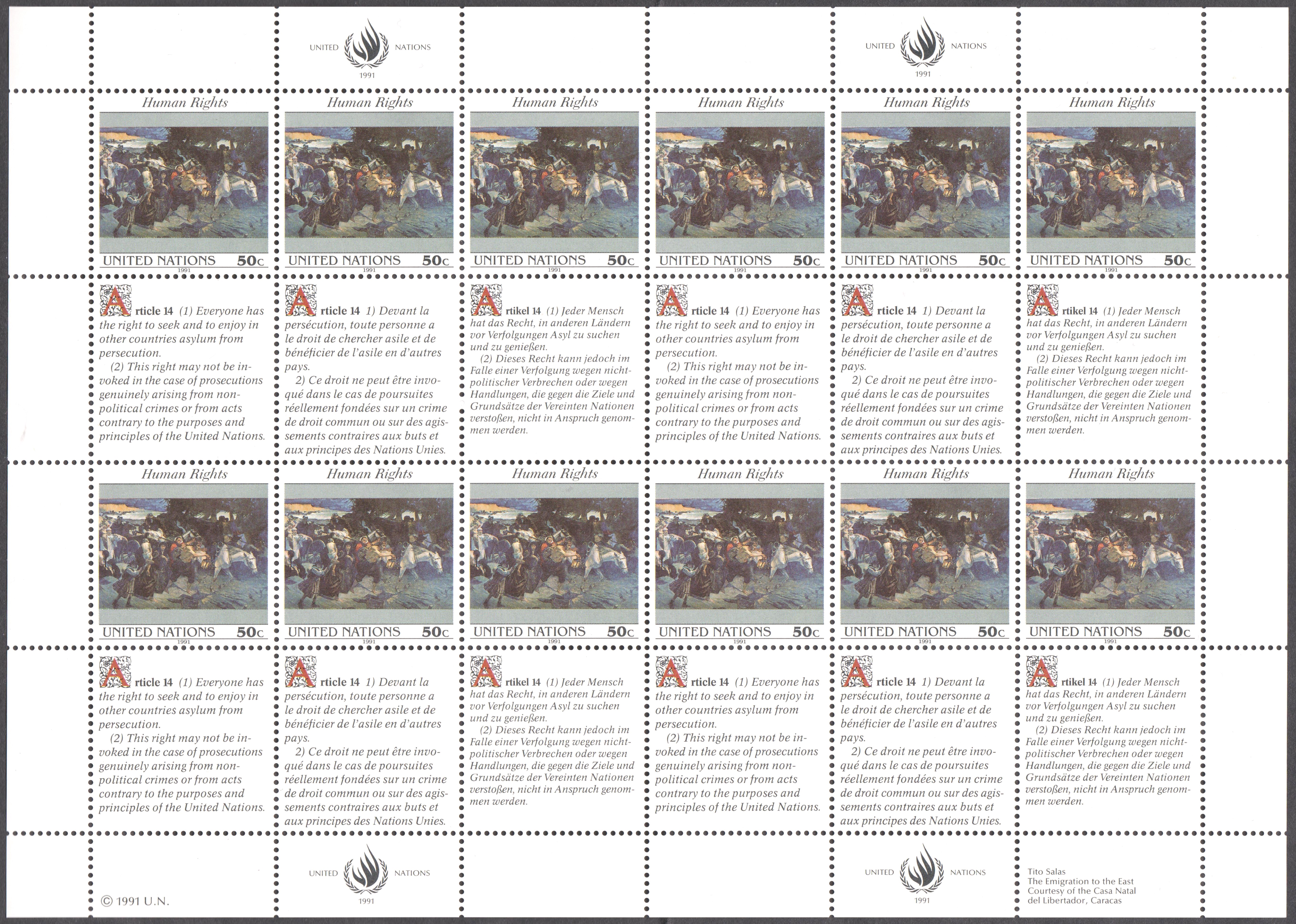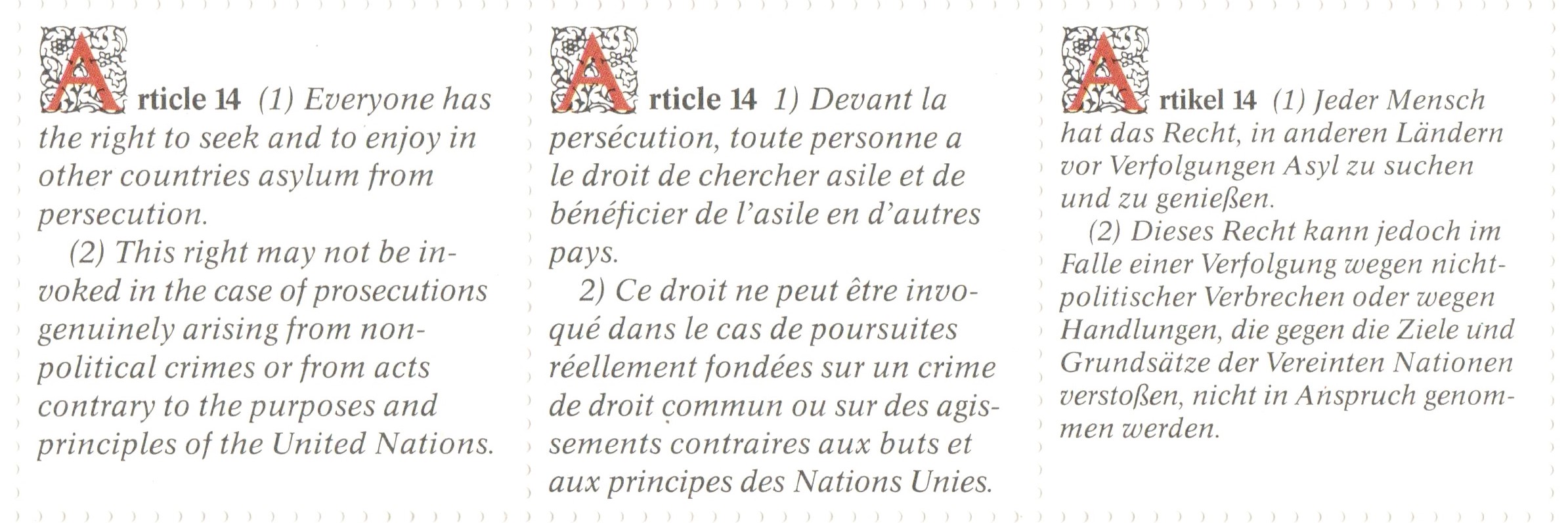 Die Zierfelder zu Vereinte Nationen - New York, MiNr. 624, zeigen Artikel 14 abwechselnd in englischer, französischer sowie deutscher Sprache: