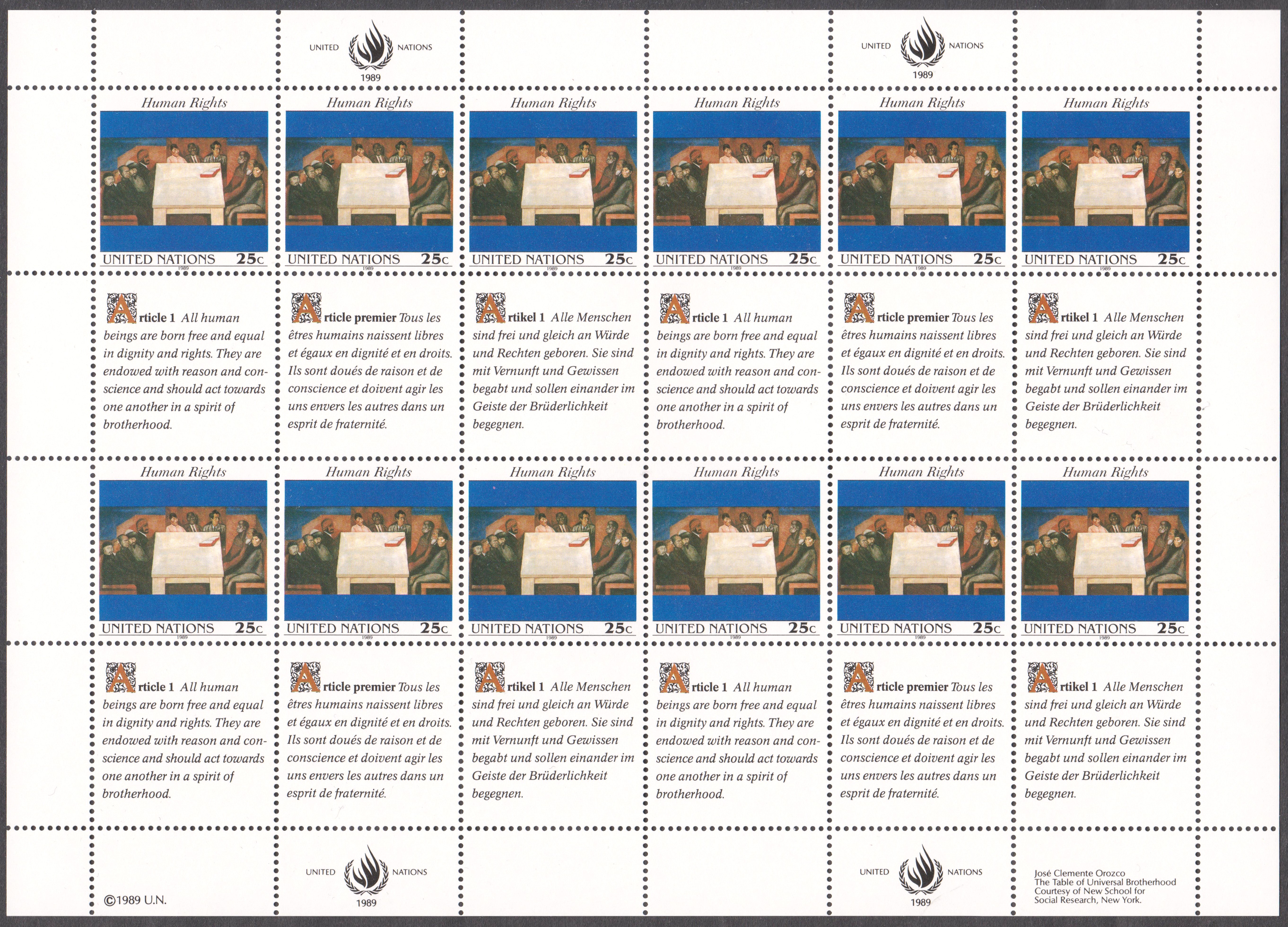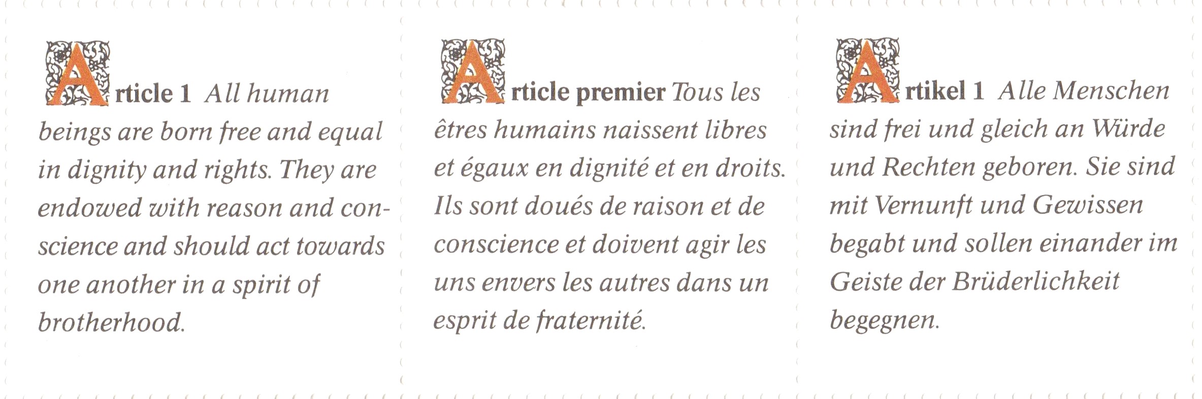 Die Zierfelder zu Vereinte Nationen - New York, MiNr. 595, zeigen Artikel 1 abwechselnd in englischer, französischer sowie deutscher Sprache: