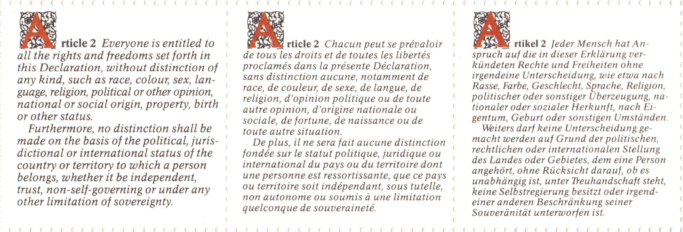 Die Zierfelder zu Vereinte Nationen - New York, MiNr. 596, zeigen Artikel 2 abwechselnd in englischer, französischer sowie deutscher Sprache:
