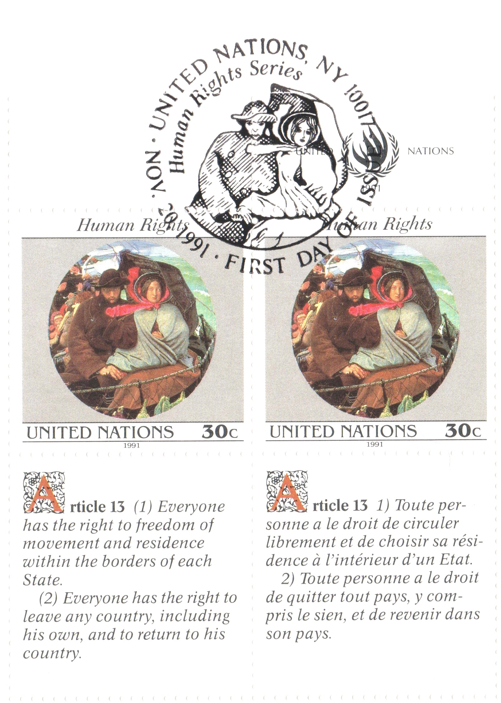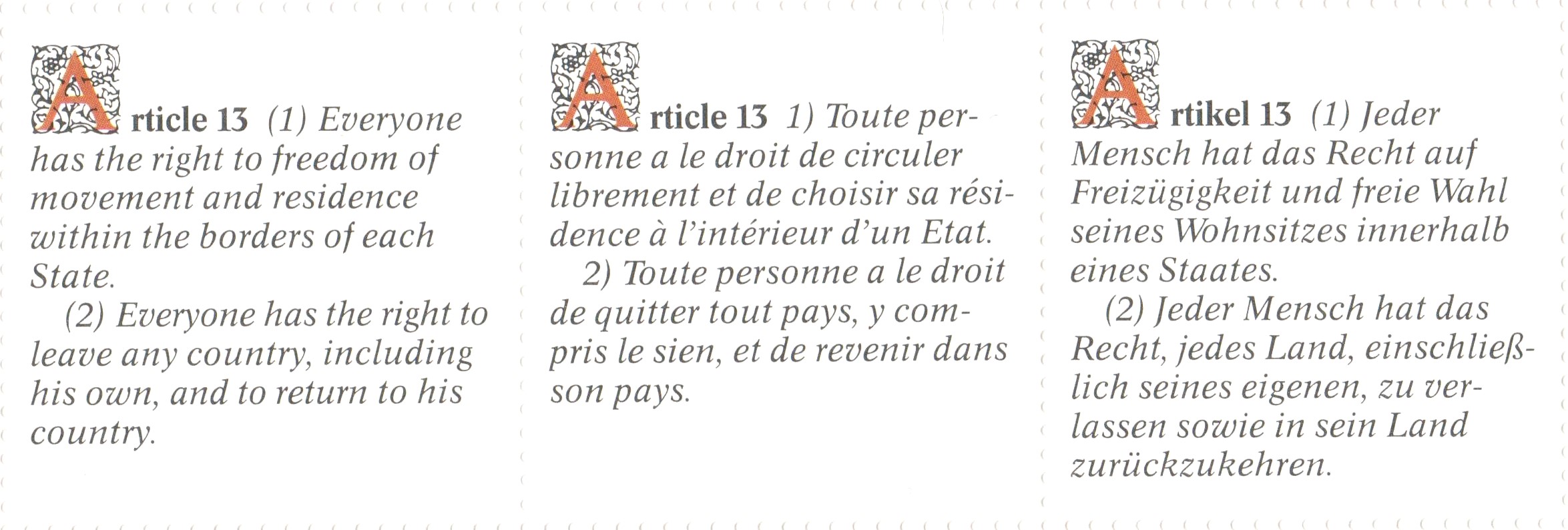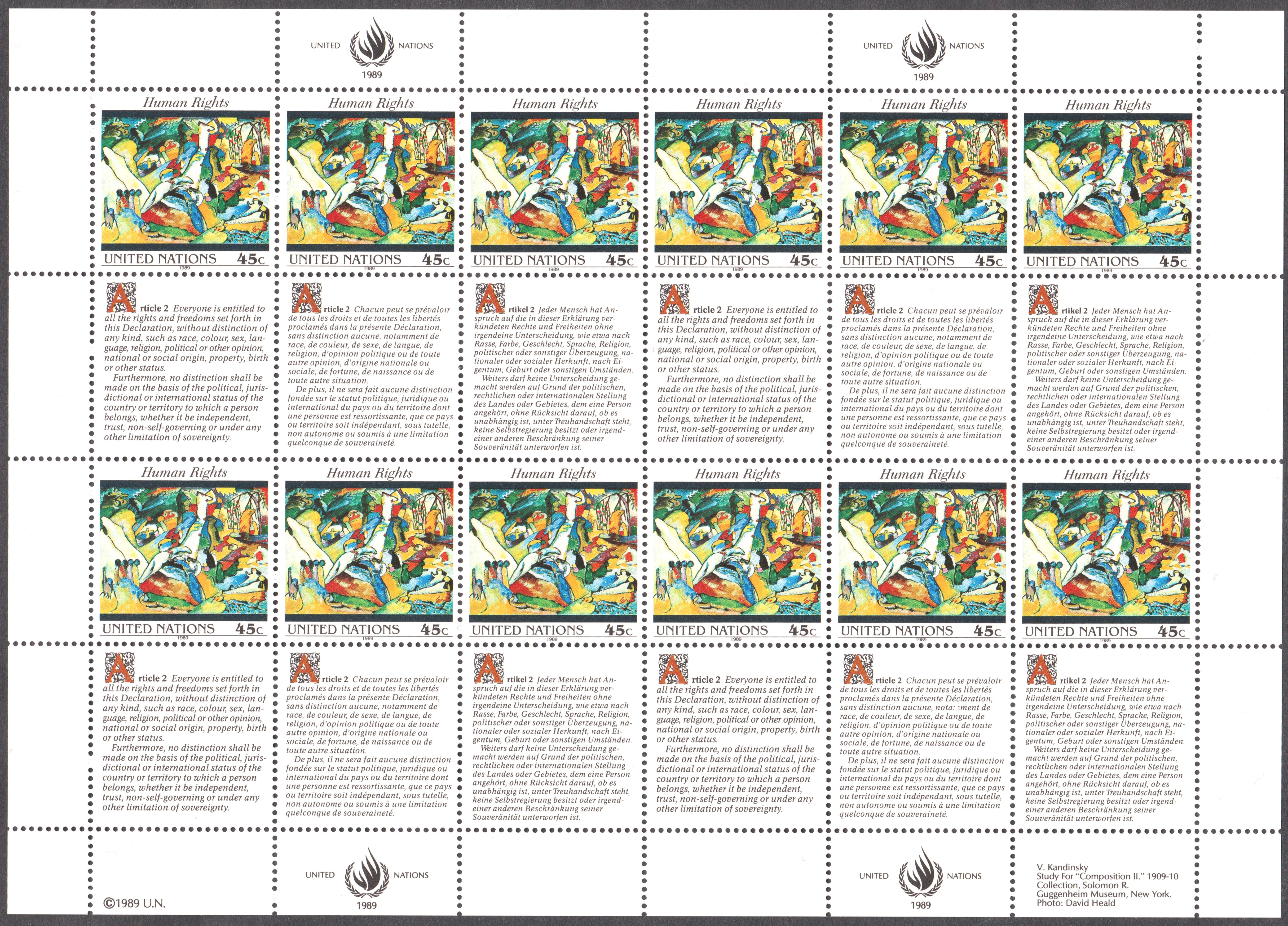 Die Zierfelder zu Vereinte Nationen - New York, MiNr. 623, zeigen Artikel 13 abwechselnd in englischer, französischer sowie deutscher Sprache: