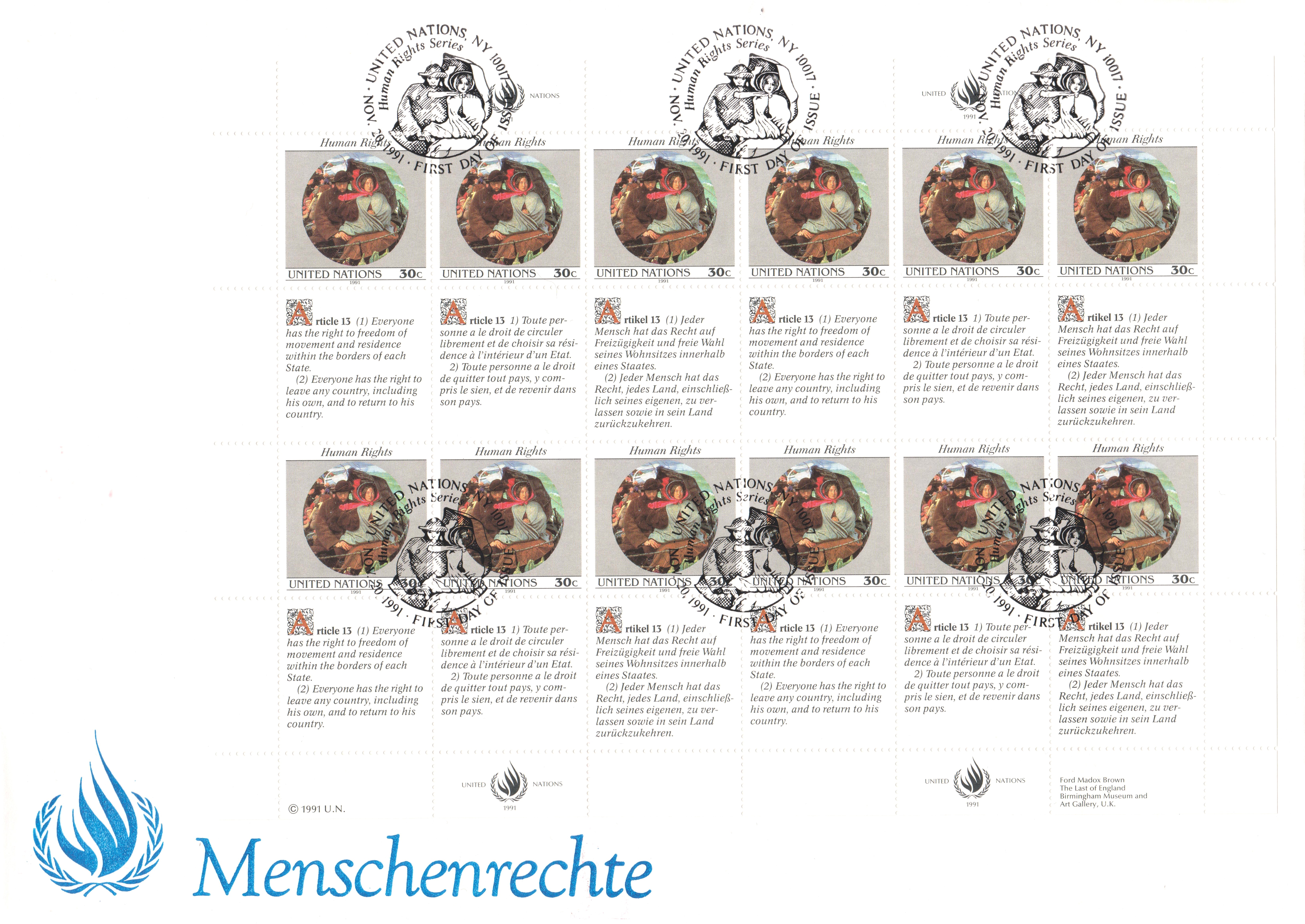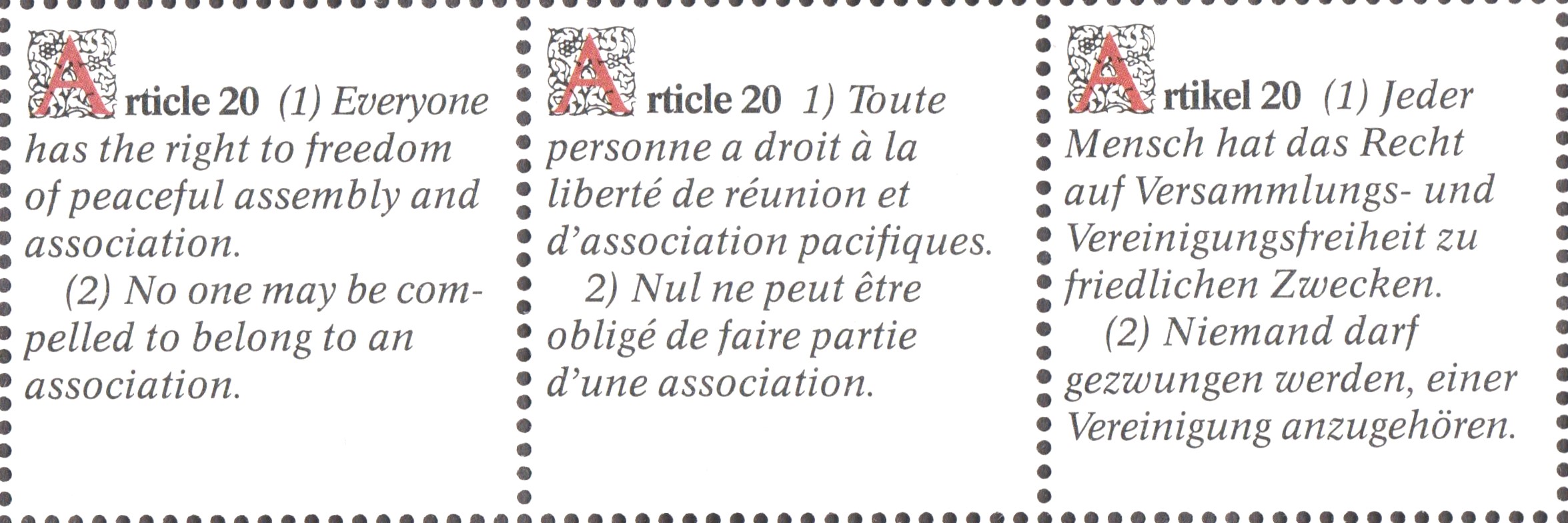 Die Zierfelder zu Vereinte Nationen - New York, MiNr. 641, zeigen Artikel 20 abwechselnd in englischer, französischer sowie deutscher Sprache: