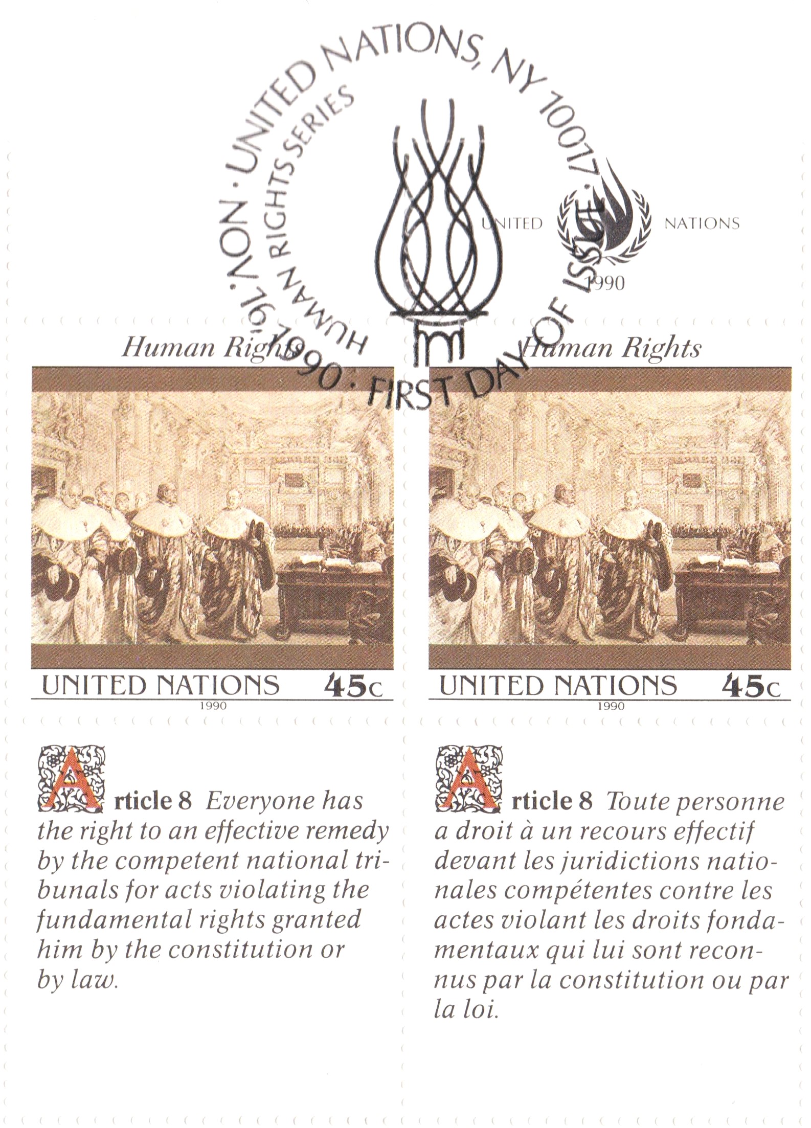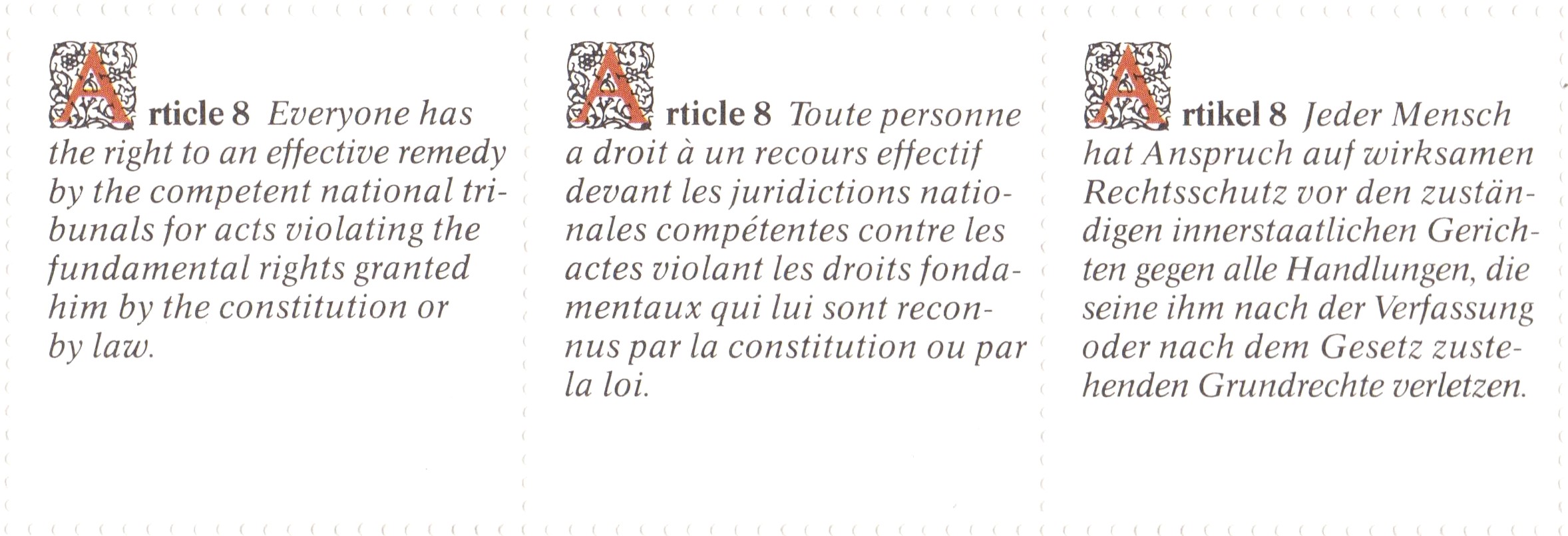 Die Zierfelder zu Vereinte Nationen - New York, MiNr. 607, zeigen Artikel 8 abwechselnd in englischer, französischer sowie deutscher Sprache: