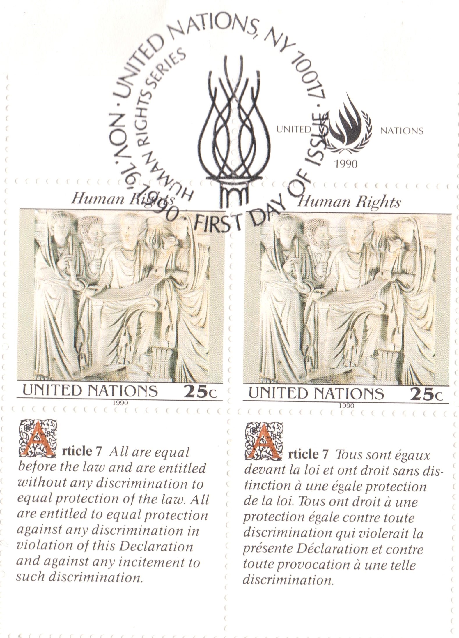 Die Zierfelder zu Vereinte Nationen - New York, MiNr. 606, zeigen Artikel 7 abwechselnd in englischer, französischer sowie deutscher Sprache: