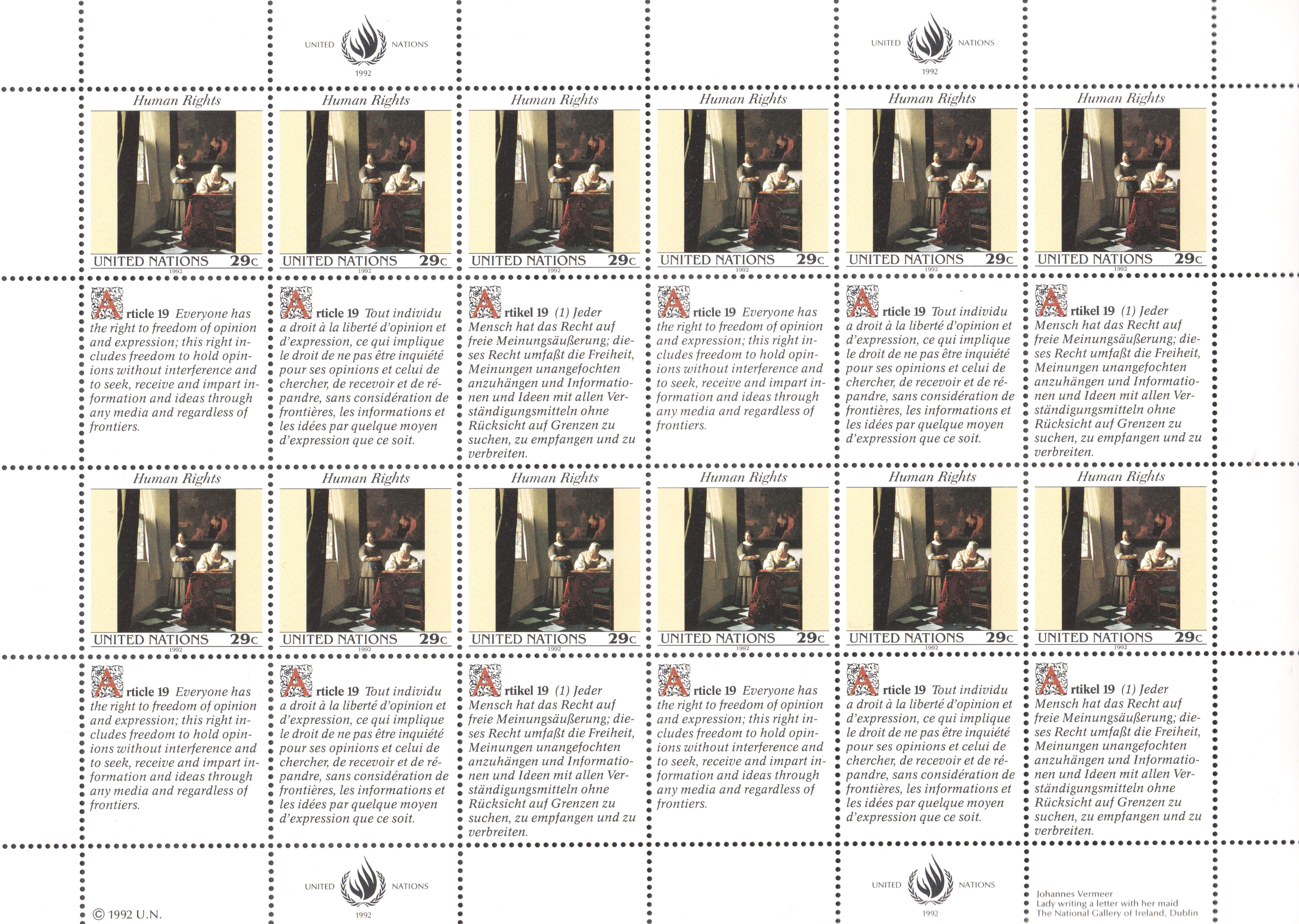 Die Zierfelder zu Vereinte Nationen - New York, MiNr. 640, zeigen Artikel 19 abwechselnd in englischer, französischer sowie deutscher Sprache: