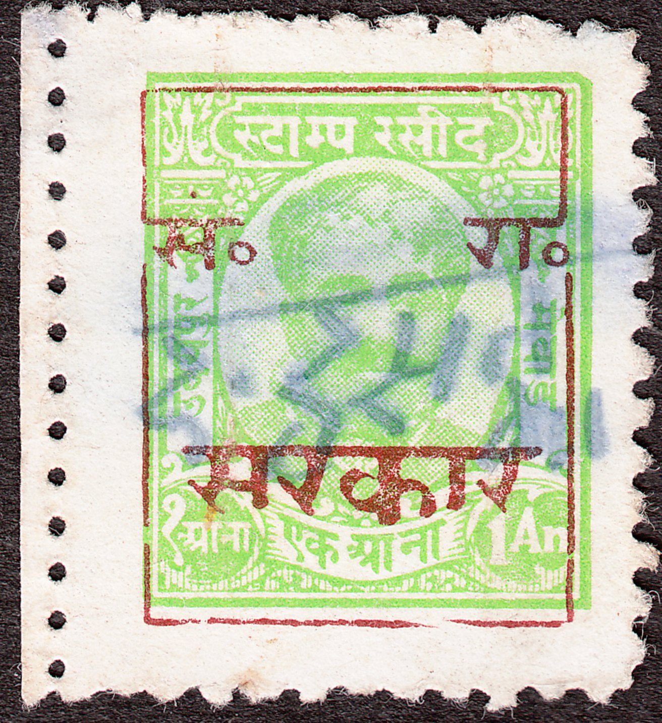 Diese in Mewar ausgegebene Gebührenmarke zu 1 Anna in gelbgrün diente, mit Aufdruck in rot versehen, in Rajasthan als Gebührenmarke: