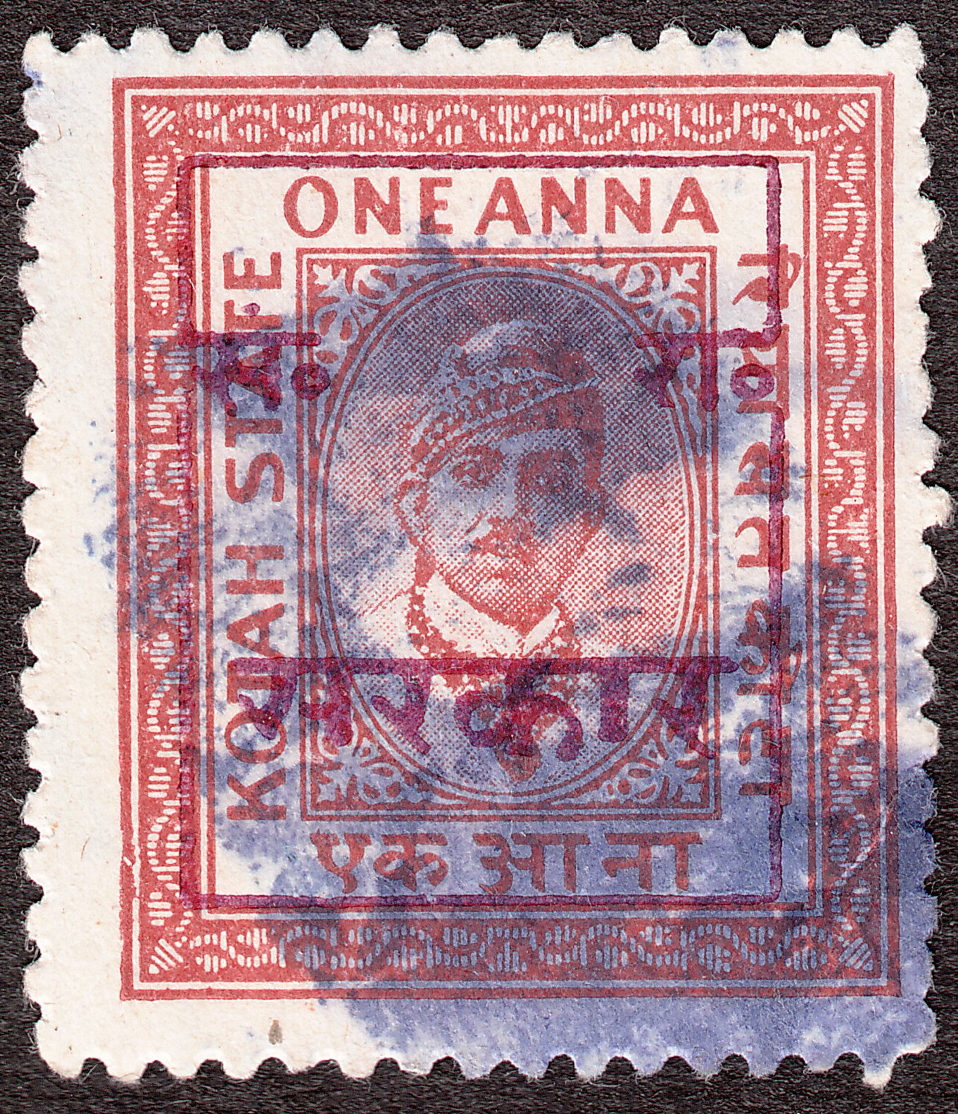 Diese in Kotha ausgegebene Gebührenmarke diente mit Aufdruck versehen in Rajasthan als Gebührenmarke: